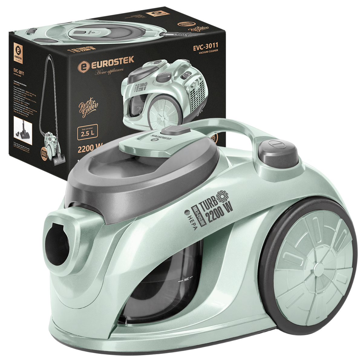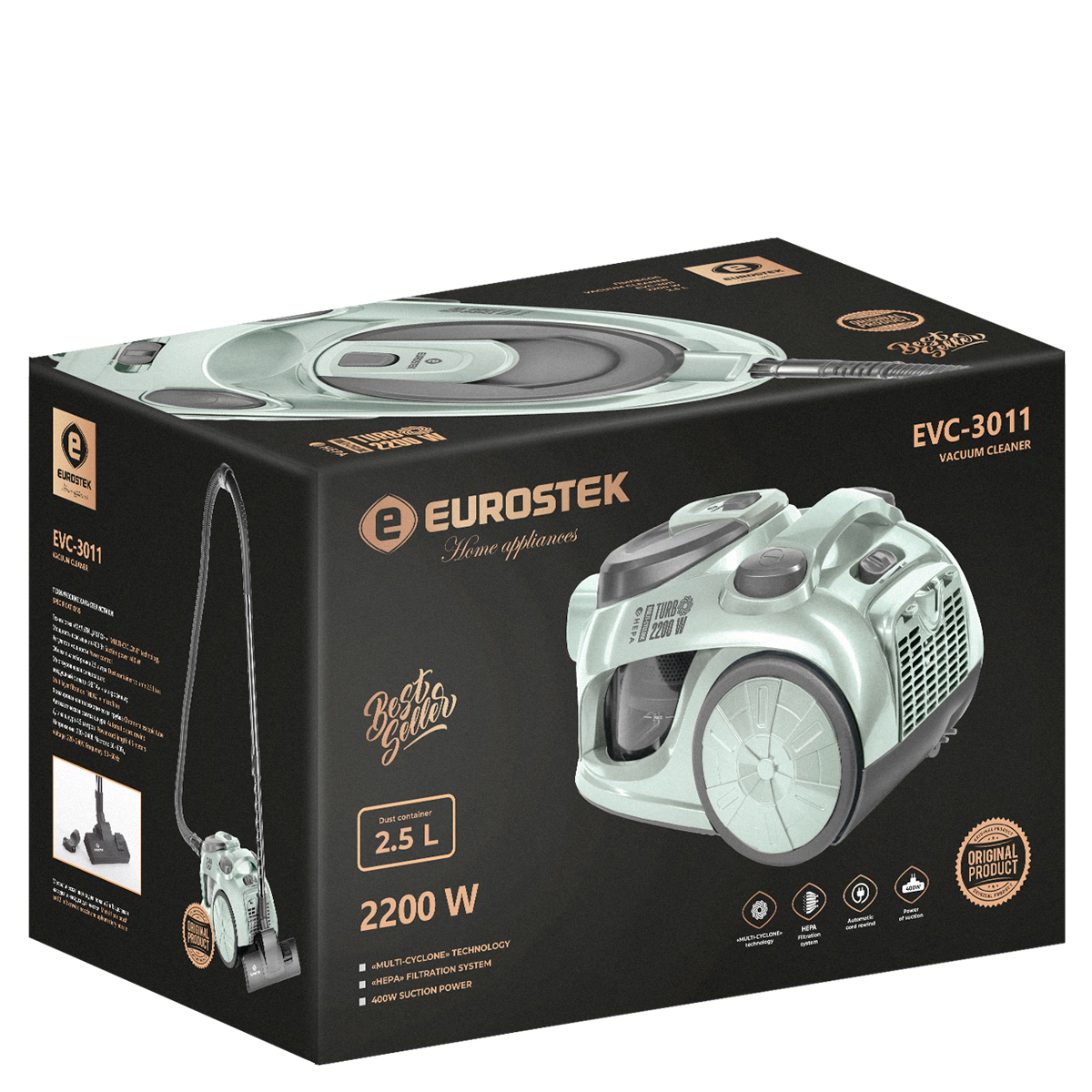 Пылесос электрический Eurostek EVC-3011 обладает мощностью в 2200 Вт., мощность всасывания составляет 400 Вт. Пылесос с многоступенчатой системой фильтрации и объемом пылесборника в 2,5 л. Шнур сматывается автоматически.