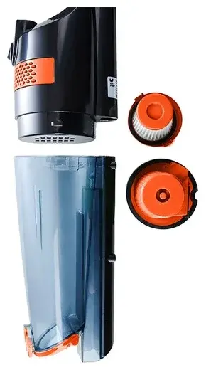 Конструкция 2 в 1 предусматривает трансформацию вертикального пылесоса в ручной. После нажатия на кнопку ручка пылесоса складывается, и можно продолжить уборку ручным пылесосом, которым удобно очищать углы и плинтусы, обивку мебели, пыль со шкафов.