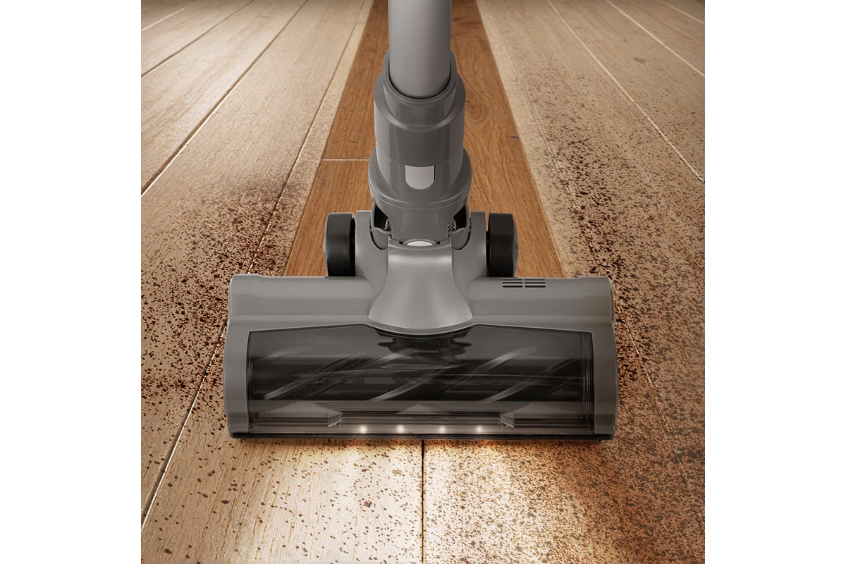 Пылесос комплектуется напольной насадкой с турбощеткой, которая помогает качественно справиться с очисткой гладких поверхностей и ковровых покрытий с не очень длинным ворсом. Светодиодная подсветка напольной щетки сделает уборку комфортной даже в затемненных местах.