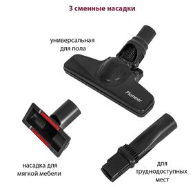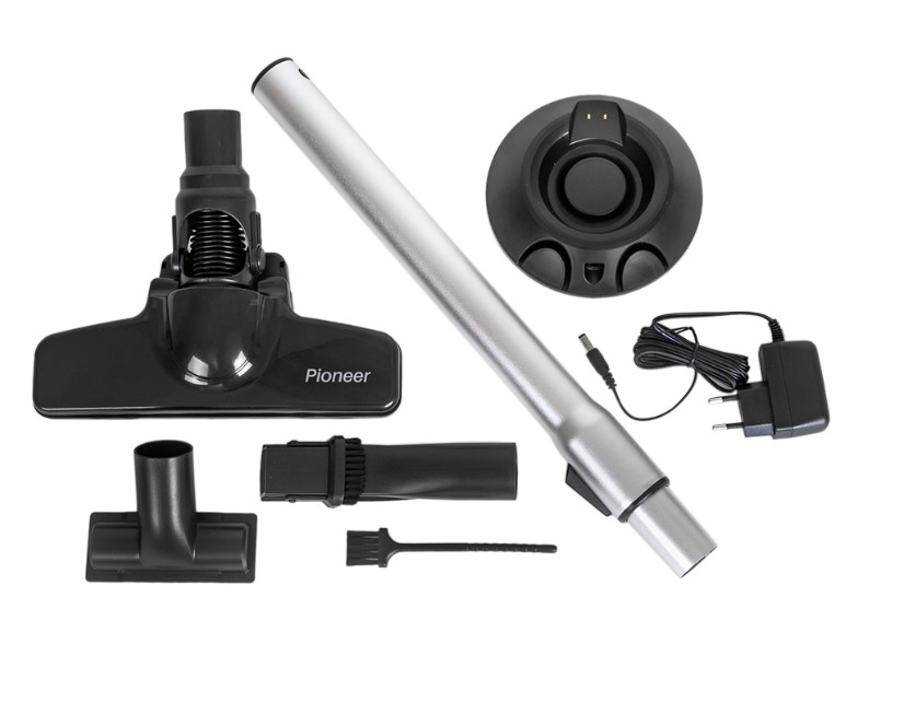 Комплектация: пылесос, адаптер питания, подставка для хранения и зарядки батареи, удлинительная трубка, щетка для пола и ковра, узкая насадка 2 в 1, насадка для мягкой мебели, гарантийный талон, инструкция на русском
