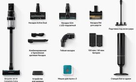 комбинированная насадка, насадка для сбора жидкости, подставка для хранения, фильтр тонкой очистки, щелевая насадка, гибкая насадка, комплект для зарядки аккумулятора, подставка под аксессуары, удлиненная щелевая насадка