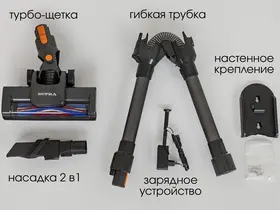 Комплектация пылесос, адаптер питания, турбо-щетка c LED-подсветкой, узкая насадка-щетка для уборки труднодоступных мест и очистки мягкой мебели, держатель насадки, настенное крепление, гарантийный талон, инструкция на русском языке