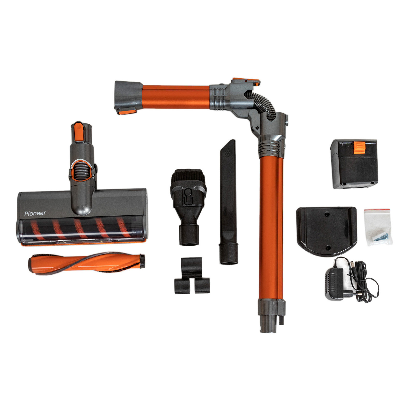 Комплектация: пылесос, съемный аккумулятор, поворотная моторизированная щетка с LED подсветкой, дополнительный сменный ролик для твердых полов, магнитная парковочная станция, щетка для мебели, насадка для труднодоступных мест, гарантийный талон, инструкция на русском языке