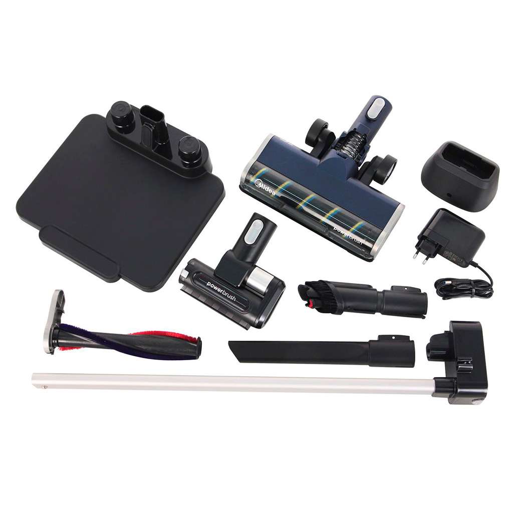 1. Щетка для мебели 2. Щелевая насадка 3. Док-станция 4. Щетка с мягким валиком для твердых поверхностей 5. Мини-электрощетка