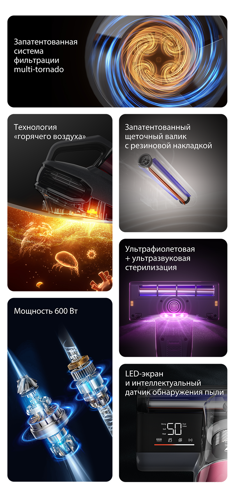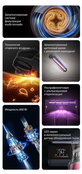 Многоступенчатая технология фильтрации, способна очистить воздух от 99,9% частиц размером 0,3 микрометра и удалить пыль и волосы. Технология позволяет не терять мощность всасывания, гарантирует защиту от загрязнения воздуха для здоровой атмосферы в доме.