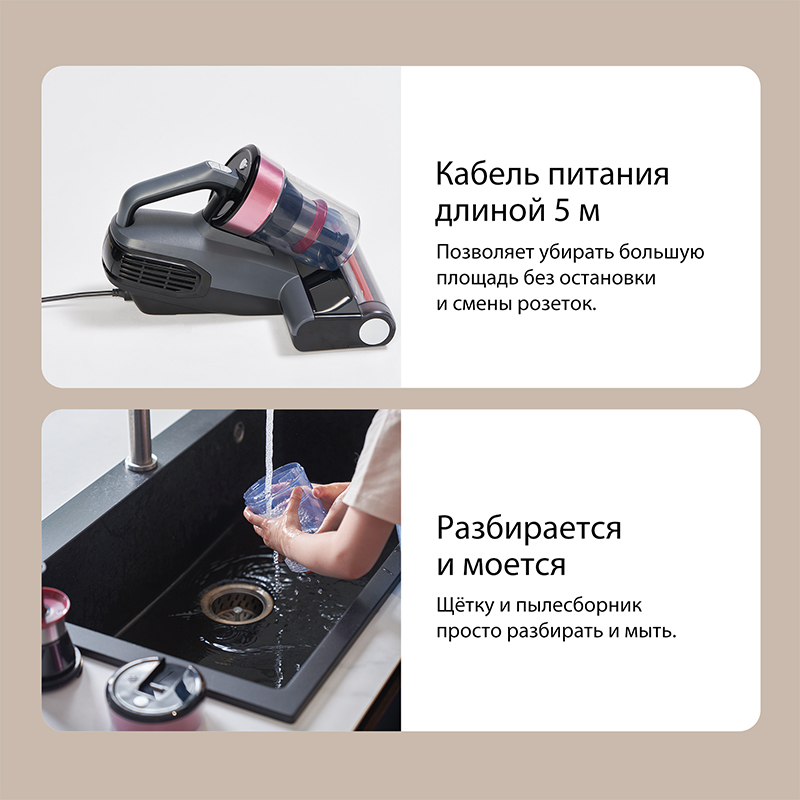 Кабель питания длиной 5 метров позволяет убирать большую площадь без остановки и смены розеток. Щётку и пылесборник просто разбирать и мыть.