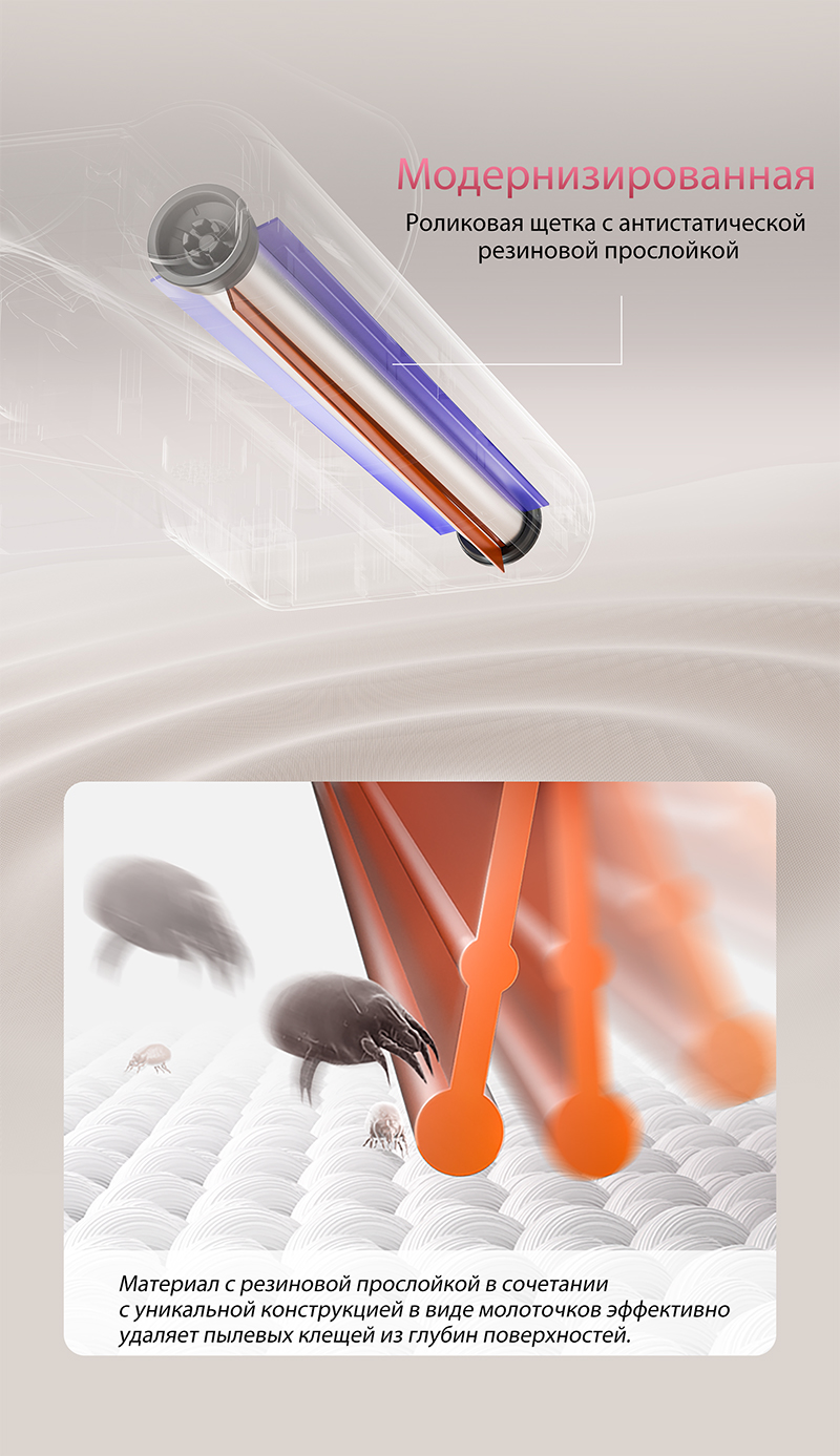 Оснащен двумя высококачественными моторами и запатентованной щеткой с резиновым слоем. Пылесос буквально вытягивает пылевых клещей и аллергены изнутри ткани. Он быстро и тщательно устраняет аллергены с кроватей, подушек, матрасов, диванов и других предметов.