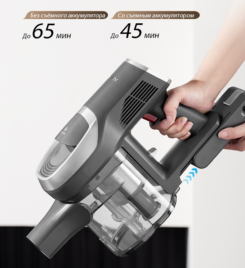 Аккумулятор емкостью 7*2500 мАч обеспечивает до 65 минут беспроводной уборки. Аккумулятор сменный, что значительно продлевает срок его службы.