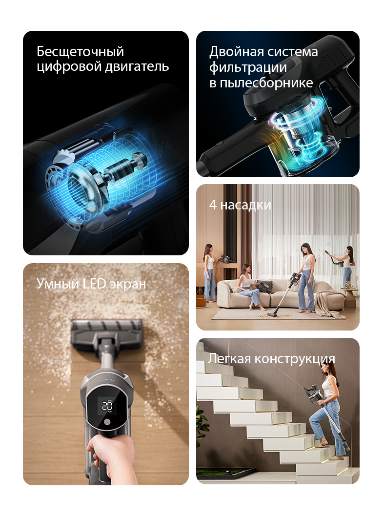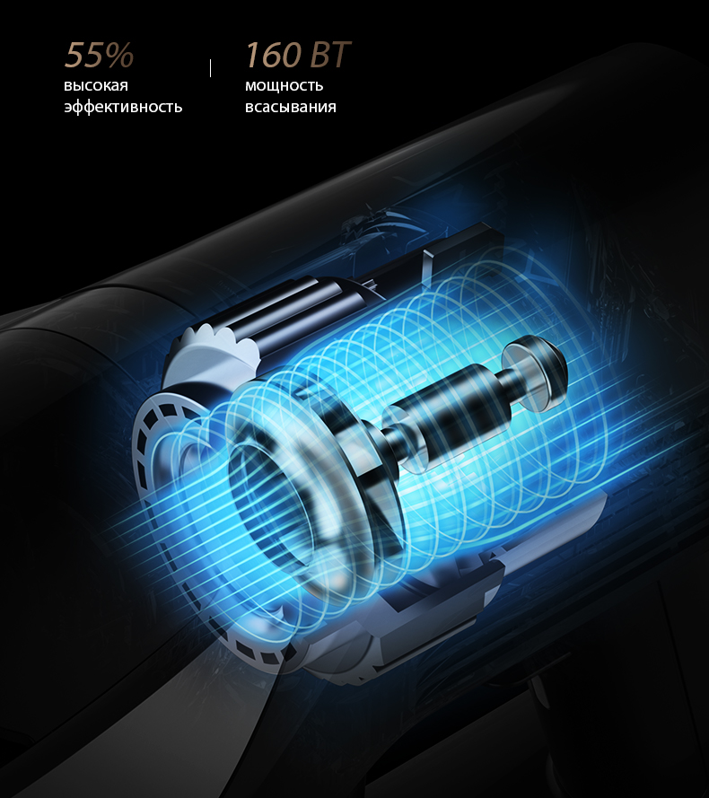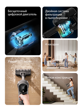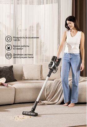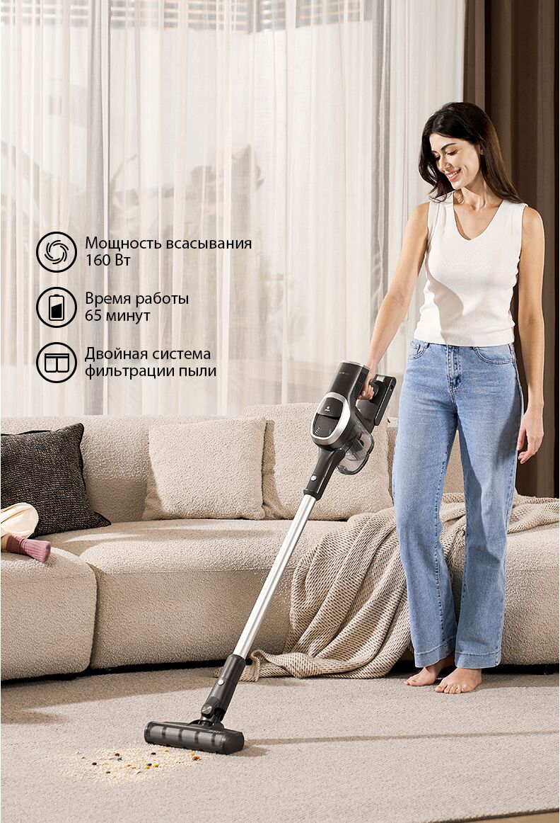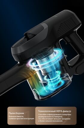 Преимущества Постоянная мощность всасывания 160 Аэроватт, Время работы на одном заряде до 65 минут, Двойная циклонная фильтрация, Легкий беспроводной дизайн