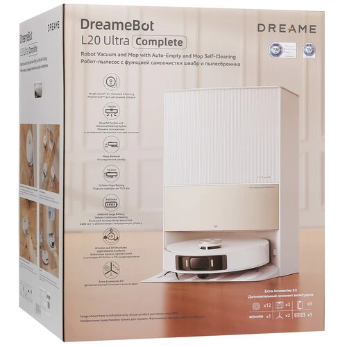 Робот-пылесос DreameBot L20 Ultra Complete имеет режимы сухой, влажной и комбинированной уборки. Технология MopExtend с использованием выдвижной швабры улучшает очистку вдоль стен и в углах. Датчик LiDAR и система навигации Pathfinder обеспечивают точное распознавание препятствий и 3D-сканирование пространства. Светодиодная подсветка улучшает обзор под мебелью. Поднимающаяся резиновая щетка и звукоизоляция двигателя гарантируют низкий уровень шума в процессе уборки. Аккумулятор емкостью 6400 мА*ч гарантирует до 260 минут автономности робота-пылесоса.