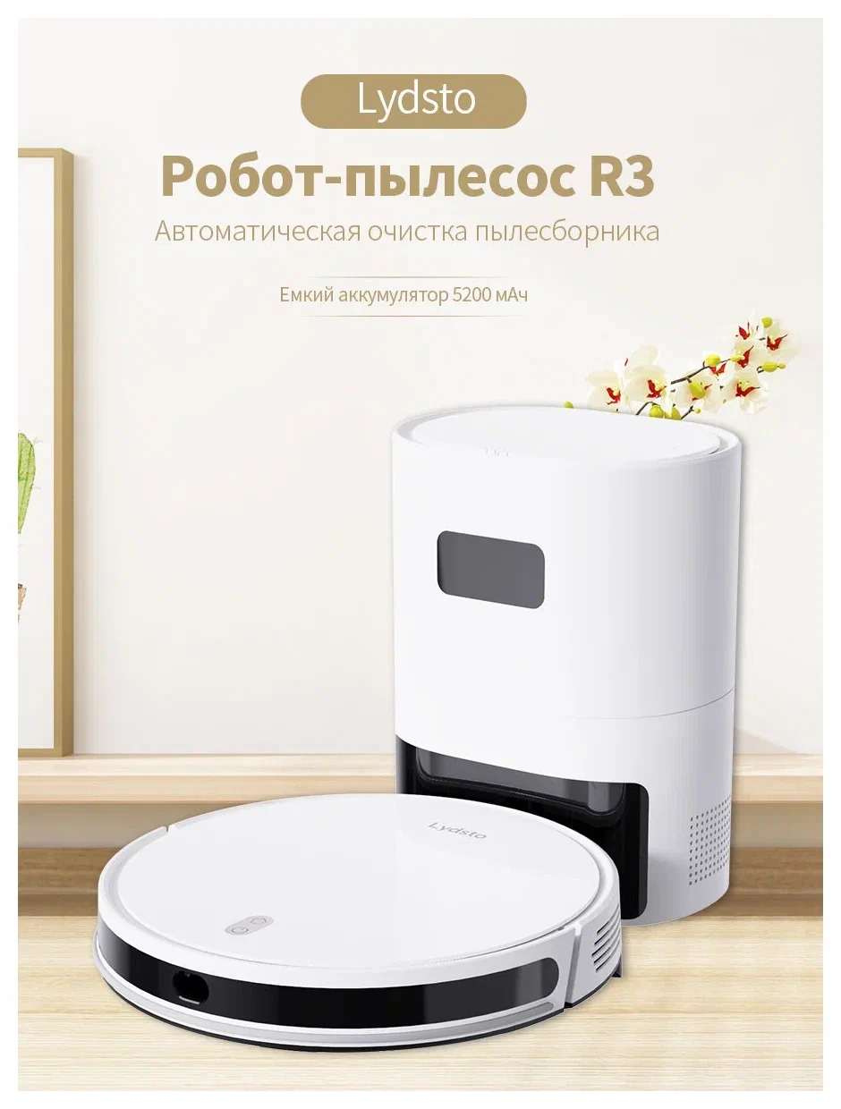 Робот-пылесос Lydsto R3 Robot Vacuum Cleaner White (EU) — со станцией самоочистки в комплекте предназначен для сухой и влажной уборки пола. Мощность всасывания 3000 Па и больше двух часов уборки от одного заряда аккумулятора.