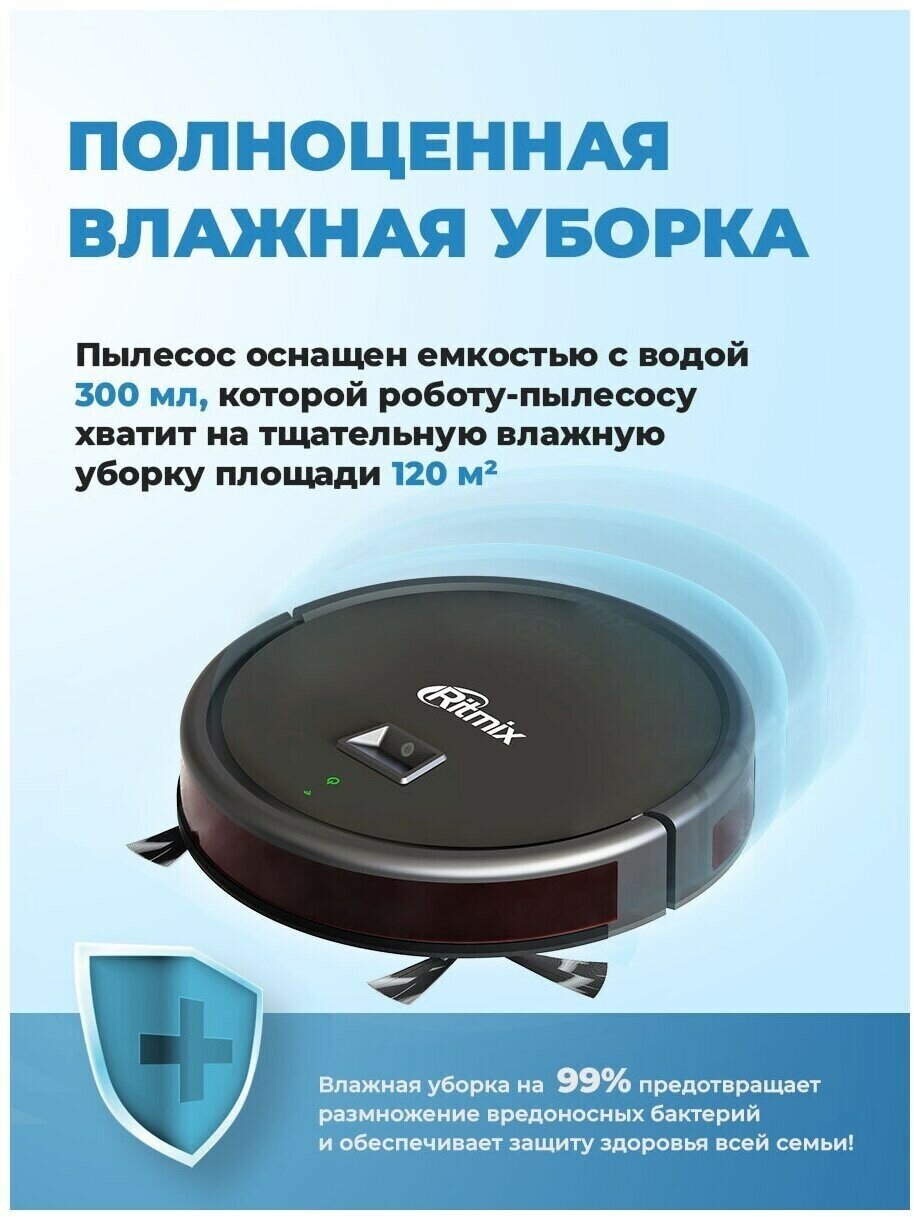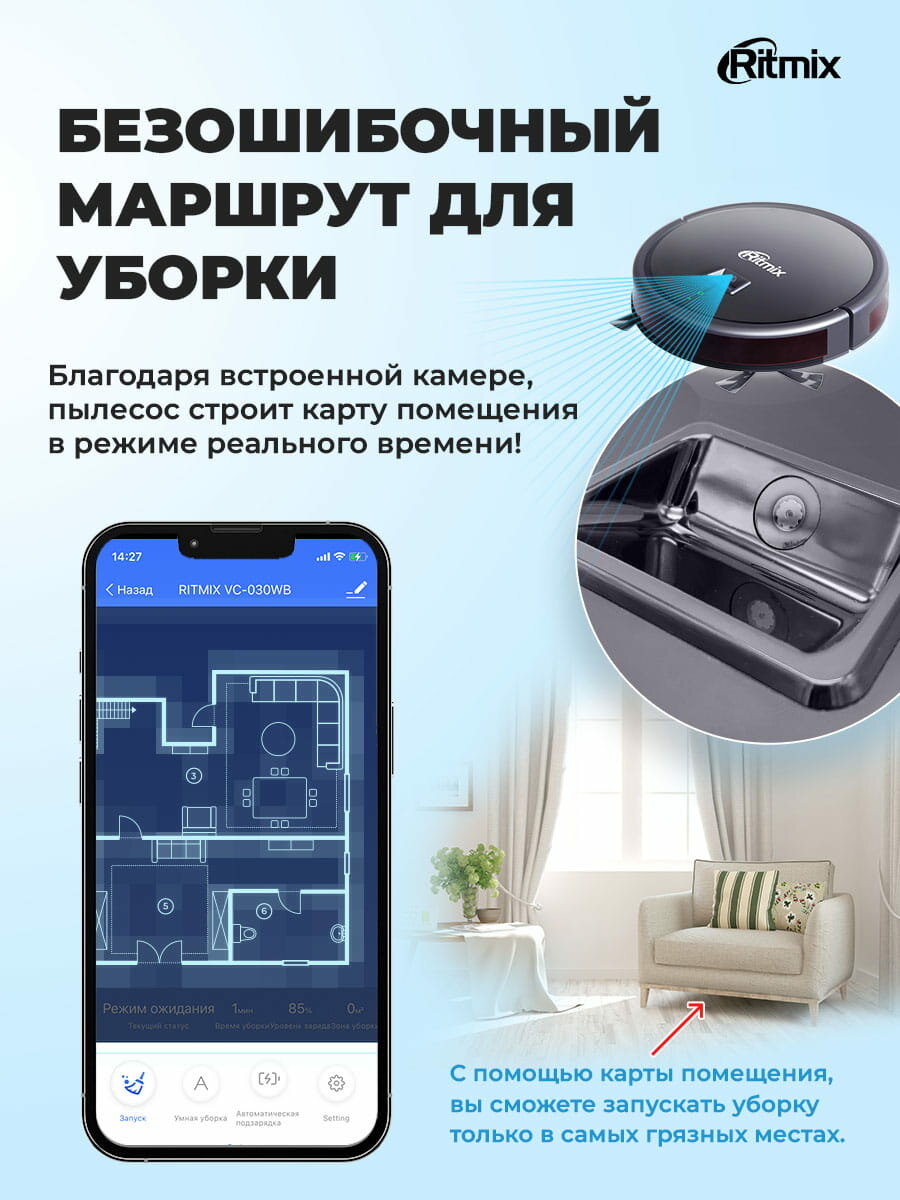 автоматическая установка на зарядное устройство; защита от падений; отложенный старт; уборка по расписанию; построение карты помещения; уборка с места остановки