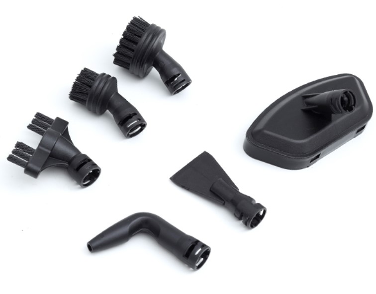 Насадки пароочистителя: Насадка для ковров, Насадка для отпаривания, Насадка для пола, Насадка для стекла, Насадка-скребок, Насадка-щетка, Угловая насадка, Тканевая насадка
