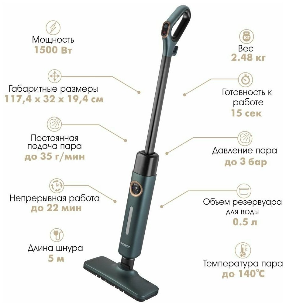 Помимо стильного и привлекательно дизайна, в изумрудно-черном исполнении, паровая швабра обладает защитными функциями: от протечки воды, от перегрева и функцией автоотключения.