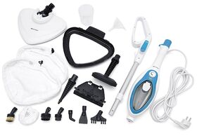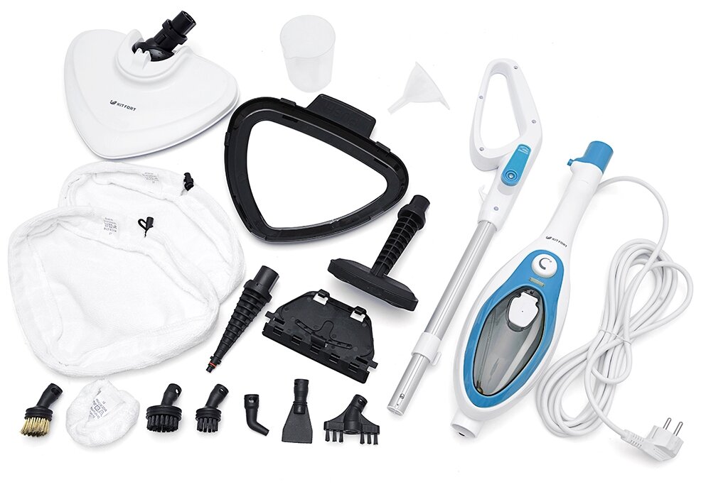 полная комплектация: щетка для пола, рамка для ковра, стакан для наливания воды, воронка, тряпка для пола - 2 шт., тряпка для отпаривания, круглая латунная щетка, большая и маленькая круглые нейлоновые щетки, угловая насадка, скребок, плоская ворсовая щетка, скребок для стекла, струйная насадка, насадка для отпаривания