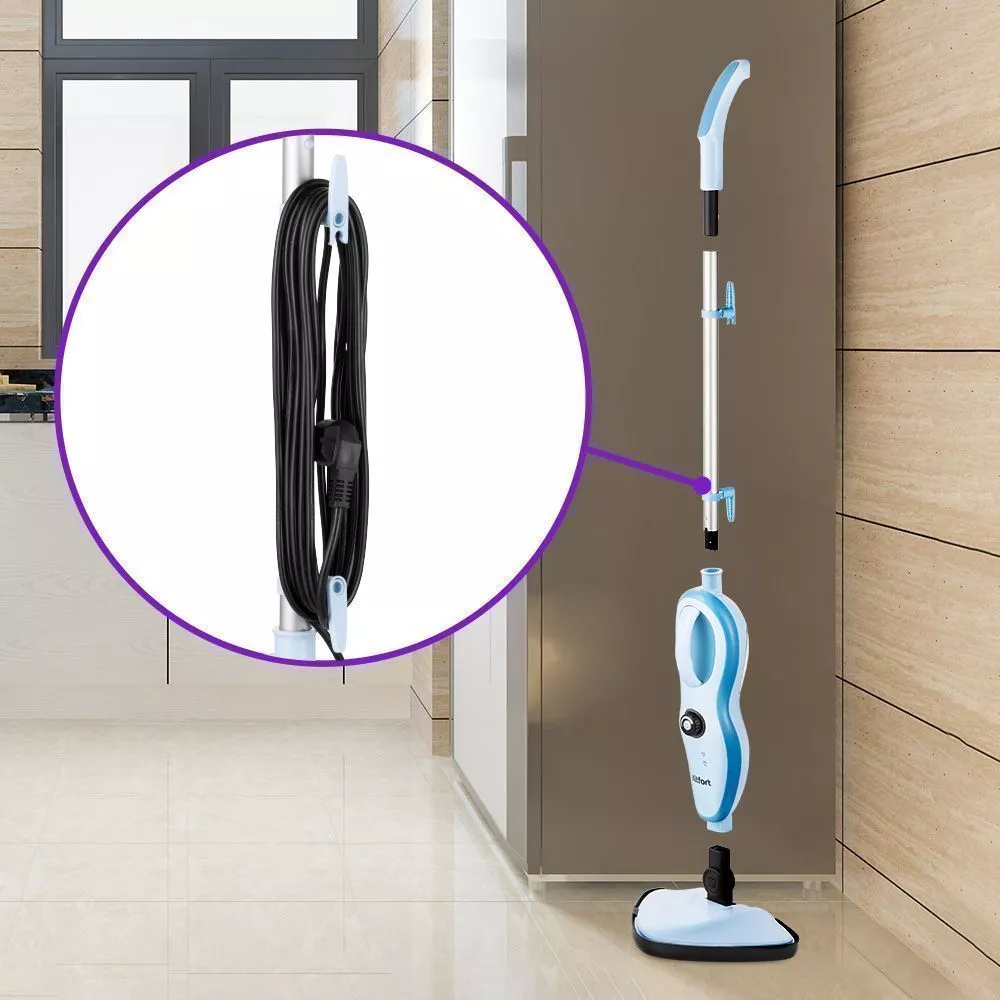 Паровая швабра КТ-1046 обладает функцией вертикальной парковки, так что вам необязательно ставить её в шкаф. На удлинительной ручке предусмотрены держатели для шнура для еще более компактного хранения. Длина шнура – 8 метров.