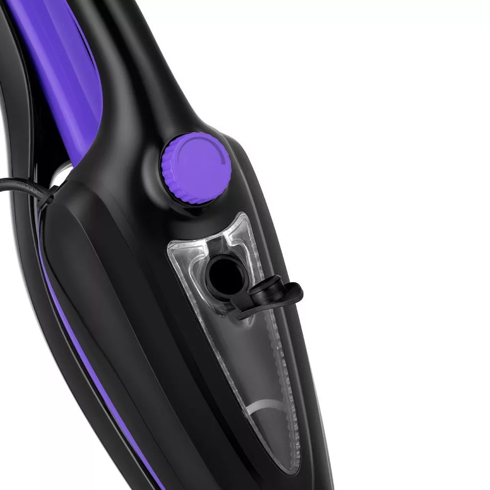 Резервуар для воды 380 мл, этого хватает на 20 минут уборки. Мерным стаканчиком в комплекте будет удобно залить воду. Кнопка над резервуаром включает и выключает нагрев, а регулятор под ним меняет уровень подачи пара.