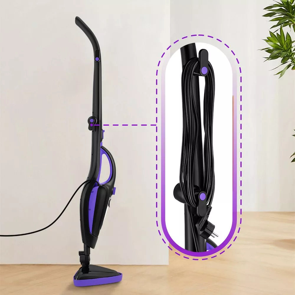 При хранении швабра не займёт много места. Шнур длиной 4,9 м не сковывает и не ограничивает ваше перемещение во время уборки. На ручке и корпусе швабры имеются держатели для смотки шнура.