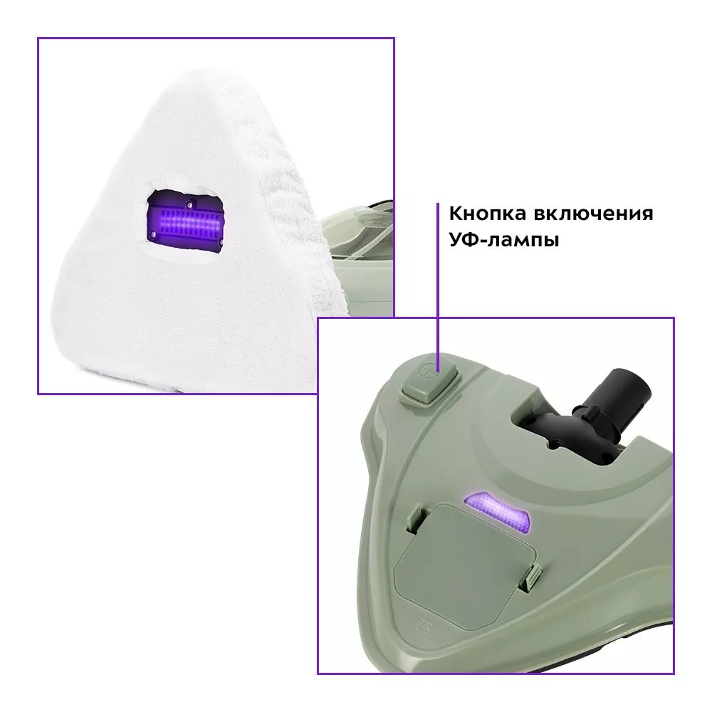 В насадке для пола установлена ультрафиолетовая лампа. Её также называют бактерицидной из-за высокой обеззараживающей эффективности по отношению к бактериям и вирусам. Питается от 3 батареек типа АА (в комплект не входят).