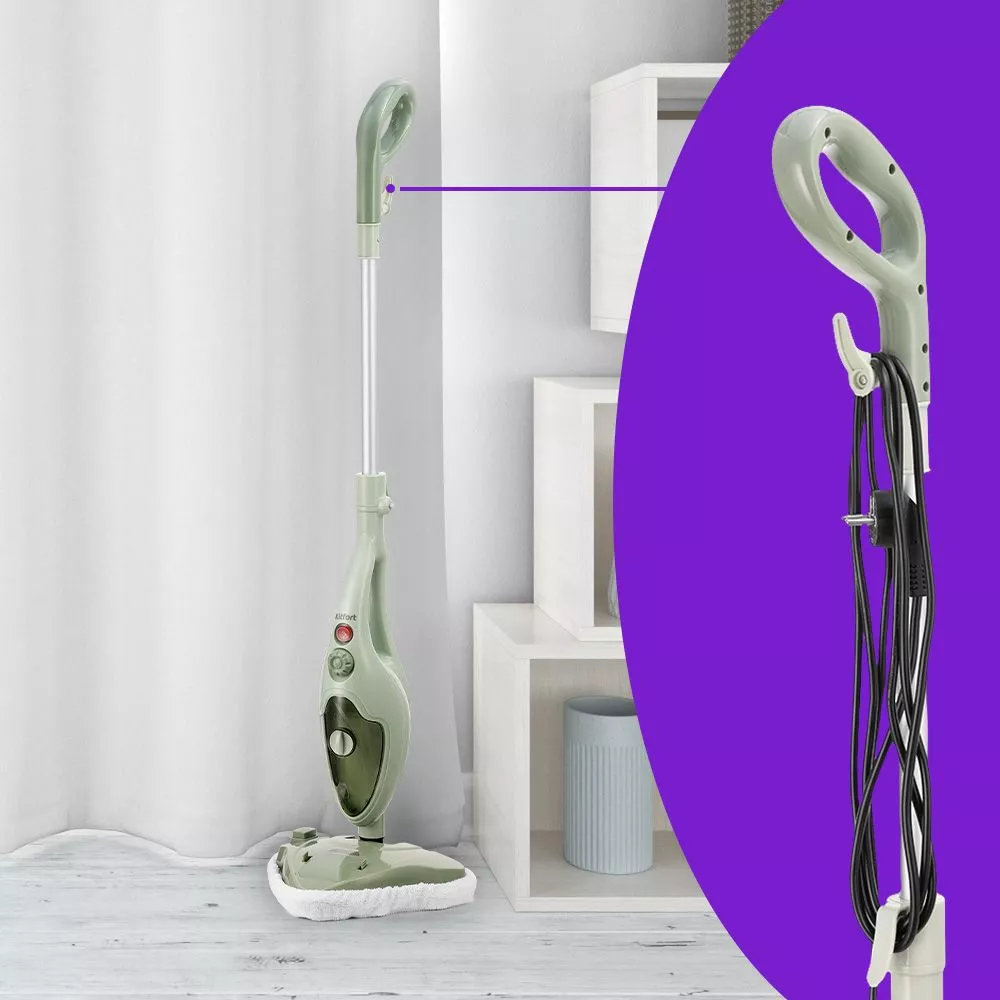 Паровая швабра КТ-1076 имеет функцию вертикальной парковки, так что вам необязательно ставить её в шкаф. На удлинительной ручке предусмотрены держатели для шнура. Его длина – 2,8 м, что очень удобно для перемещения по квартире во время уборки.