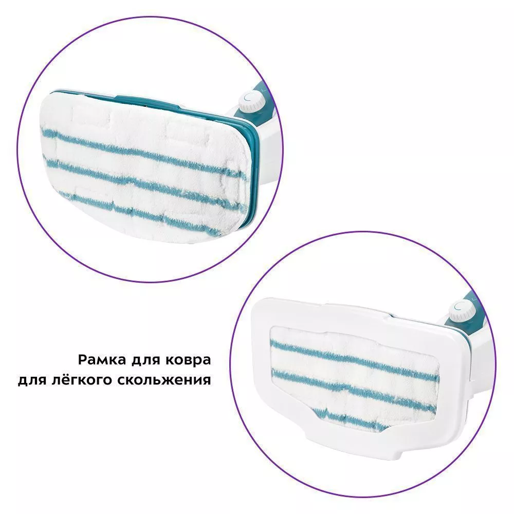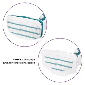 Тряпка для пола устанавливается на напольную щётку с помощью липучек. Её можно стирать в стиральной машине в тёплой воде. В комплекте есть рамка для ковра, которая обеспечивает лёгкое скольжение щётки во время чистки.