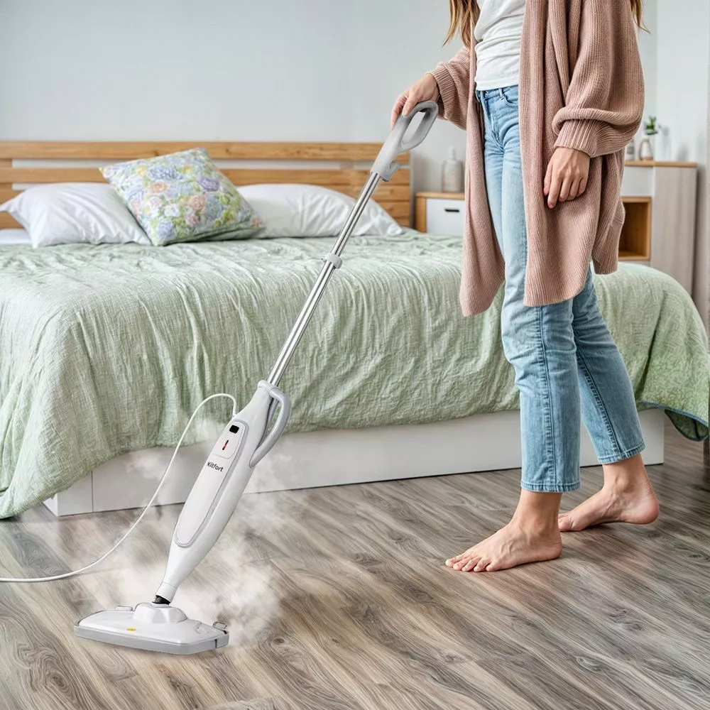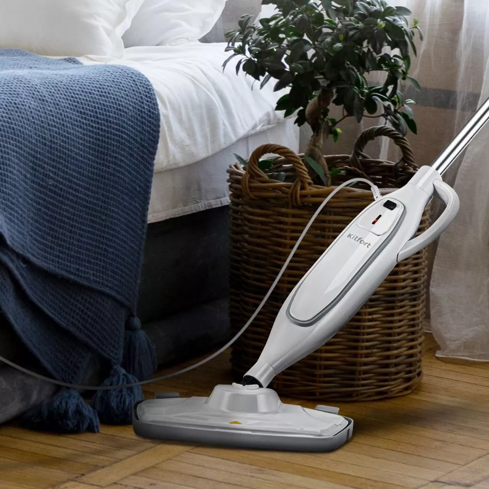 Паровая швабра КТ-3903 имеет большой угол наклона и манёвренную щётку, что делает её максимально удобной для чистки полов под мебелью и в других труднодоступных местах. Эффективная уборка без бытовой химии!