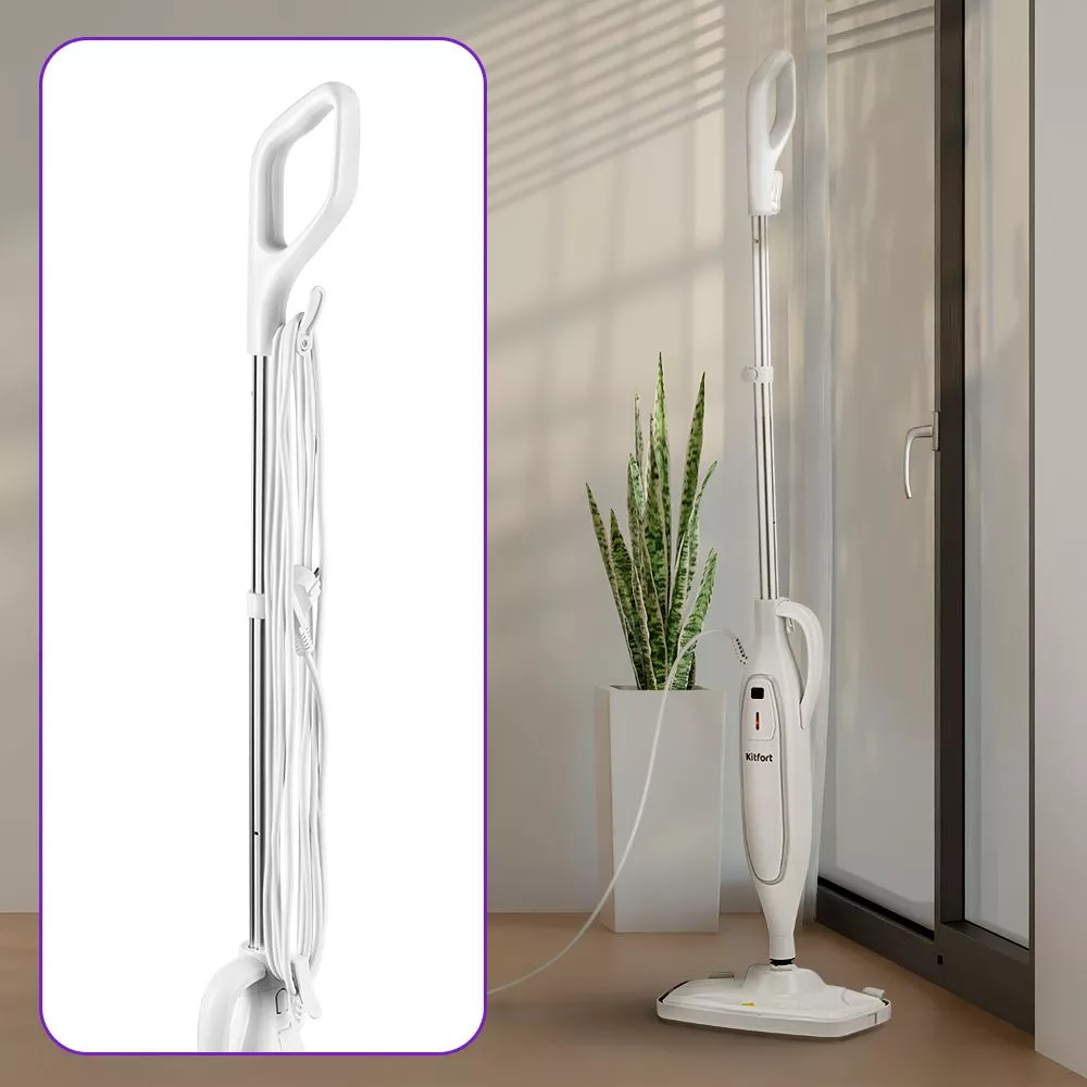 Паровая швабра КТ-3903 обладает функцией вертикальной парковки, что делает её хранение ещё более удобным и универсальным. Благодаря компактным размерам и держателям для шнура на рукоятке и корпусе, она не будет занимать много места.