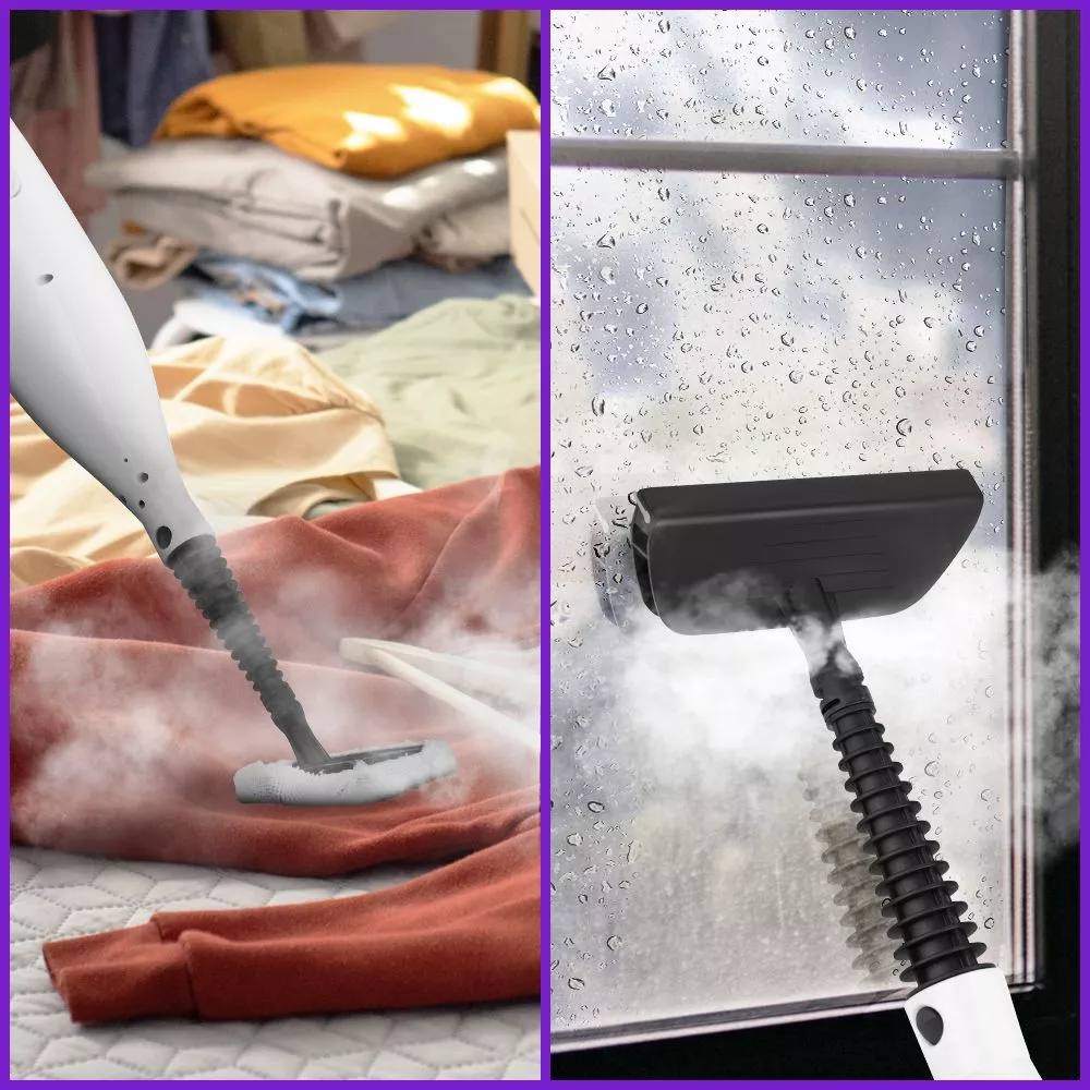 Чтобы помыть окна, зеркала и кафельную плитку, присоедините к парогенератору насадку для отпаривания со скребком для стекла, и прибор можно будет использовать как стеклоочиститель. Вы можете отпарить одежду или очистить обивку мягкой мебели.