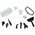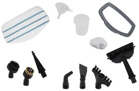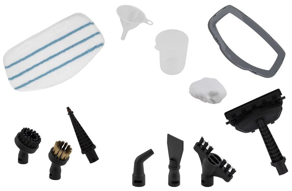в комплекте аксессуары: воронка, скребок и мерный стаканчик, скребок для стекол и рамка для ковра, ворсовая щетка, большая круглая нейлоновая щетка для удаления стойких загрязнений, маленькая металлическая щетка для удаления особо стойких загрязнений, струйная насадка (используется для очистки углов, плинтусов, щелей и других труднодоступных мест), салфетка из микрофибры х 2 шт.
