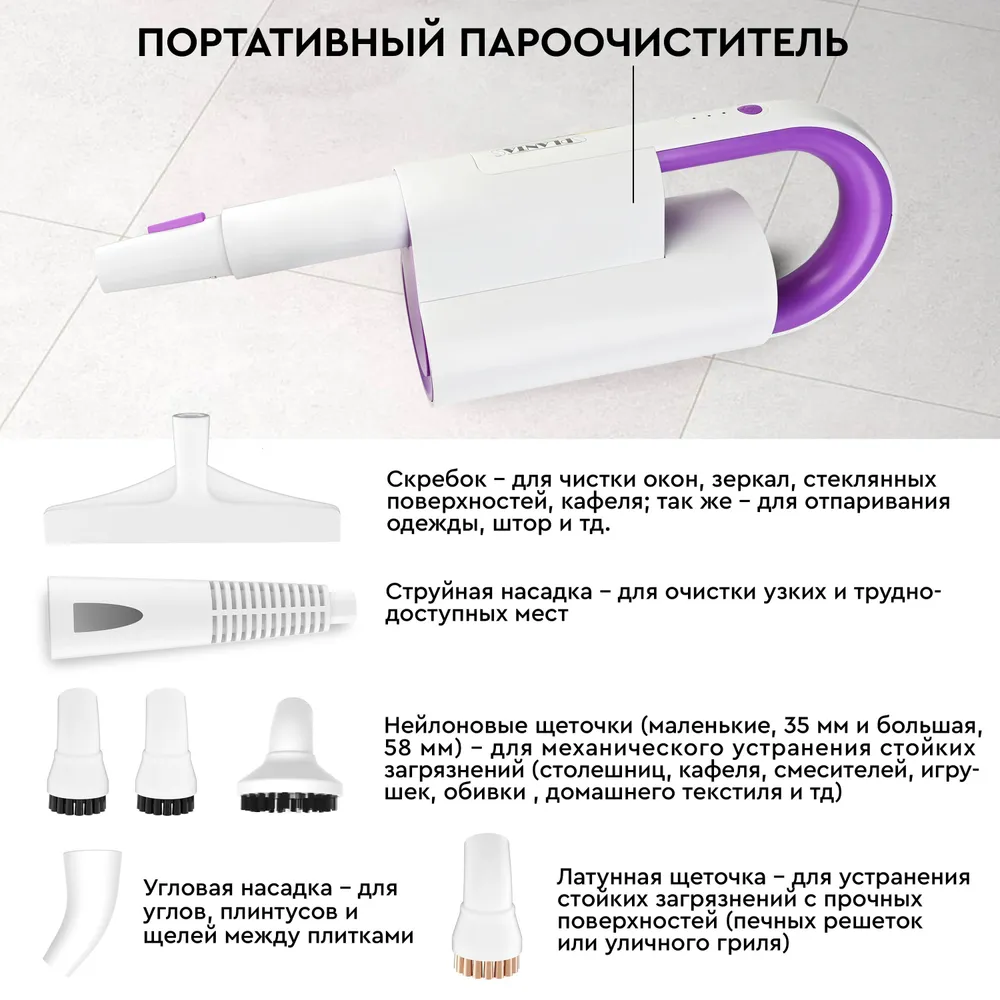 Насадки пароочистителя: Насадка для стекла, Точечная насадка, Угловая насадка, Насадка-щетка, Насадка для пола