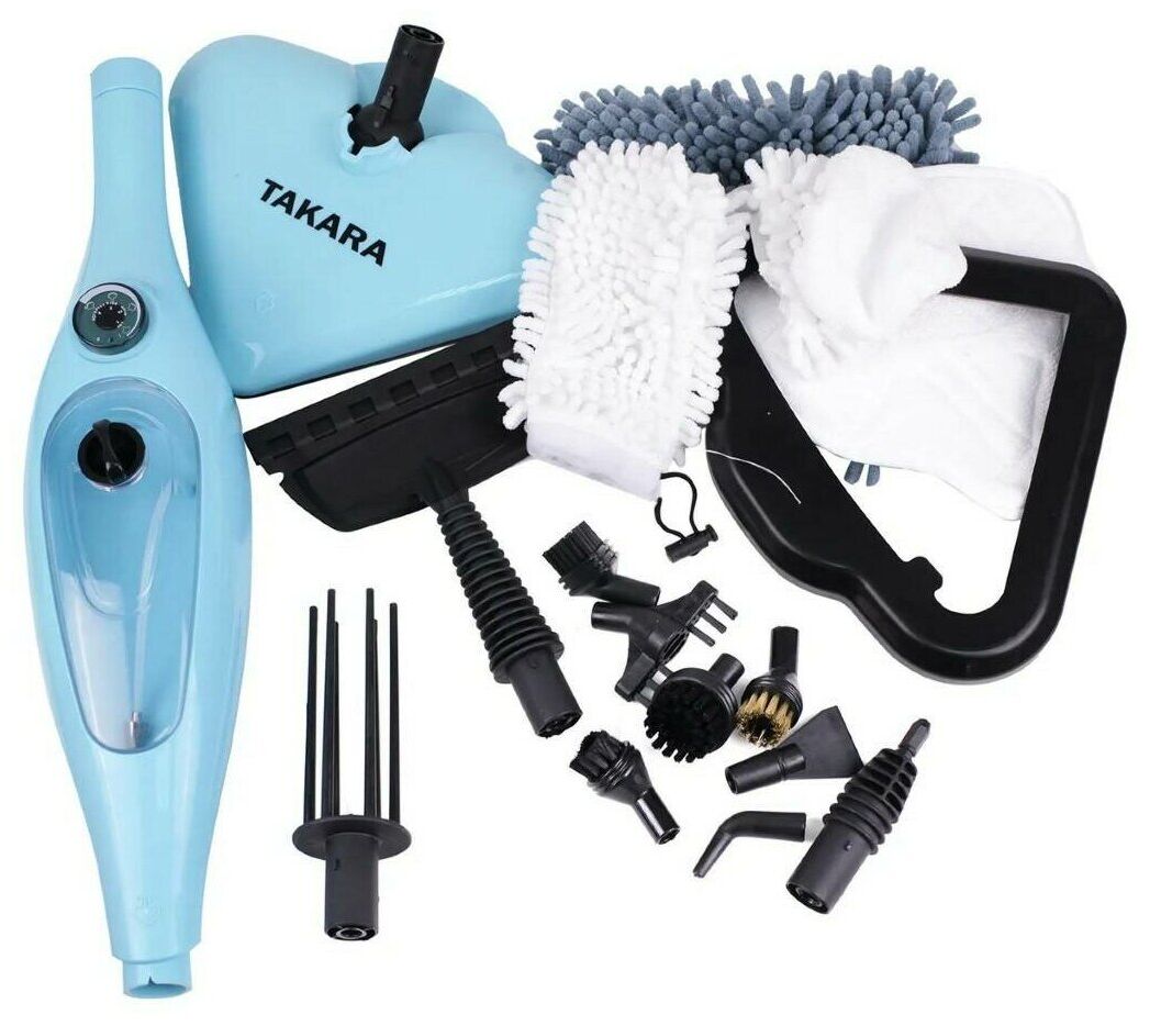1*паровая швабра, 1*оконный ракель/отпариватель одежды, 2* круглых щетки разного размера для чистки, 2*треугольных насадки-щетки, 1*угловая насадка, 1*насадка для очистки швов, 1*насадка скребок, 1*нейлоновая насадка, 2*ткань для отпаривания одежды, 2*тканевая насадка для пола,1насадка+ткань для удаления пыли, 1*мерный стакан для воды, 1*инструкция