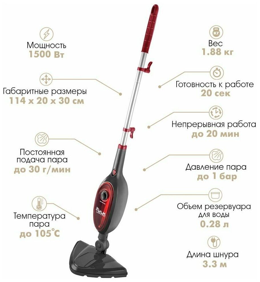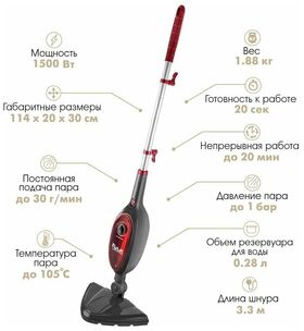 Специальная конструкция позволяет использовать паровую швабру как ручной отпариватель и пароочиститель.