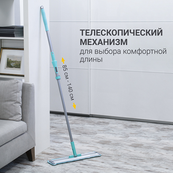 Классическая швабра Cosmic Home предназначена для влажной уборки любых видов напольных покрытий, в том числе и деликатных полов. Швабра Cosmic Home идеально подходит для тех, кто предпочитает регулировать степень влажности насадки самостоятельно. Супертонкая платформа из алюминия позволяет делать уборку в зазорах менее 1,5 см. Швабра оснащена телескопическим механизмом, что позволяет выбрать комфортную длину для вашего роста – минимальная 85см, максимальная длина 137 см. С помощью уникального слайд механизма черенок можно смещать относительно платформы в крайнее положение. С помощью этой опции легко делать уборку пола в труднодоступных местах, не отодвигая мебель. Мягкая ручка из вспененного пластика, удобная для захвата двумя руками, защищает руки от образования мозолей. Платформа легко вращается на 360 градусов, а равномерный прижим платформы к полу позволяет делать уборку без разводов. В комплекте к швабре предусмотрена щетка из пластика для отжима насадки и удаления шерсти, грязи и волос. Швабра Cosmic Home производится из ударопрочного ABS пластика. Насадка швабры из микрофибры обладает хорошей способностью впитывать и удерживать воду, легко отжимается, не впитывает запахи, прочно крепится к платформе швабры на липучки и выдерживает до 600 циклов уборки. Размер насадки больше, чем размер платформы для защиты мебели от царапин и повреждений при уборке. На ручке швабры есть петля для подвеса на крючок, что позволяет хранить ее компактно.