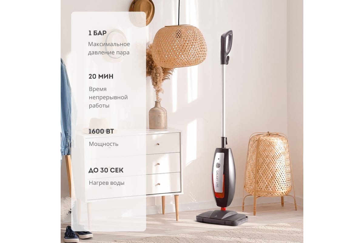 Паровая швабра Galaxy LINE GL 6400 мощность 1600 Вт гл6400л предназначена для мытья и дезинфекции любой поверхности без применения моющих средств.