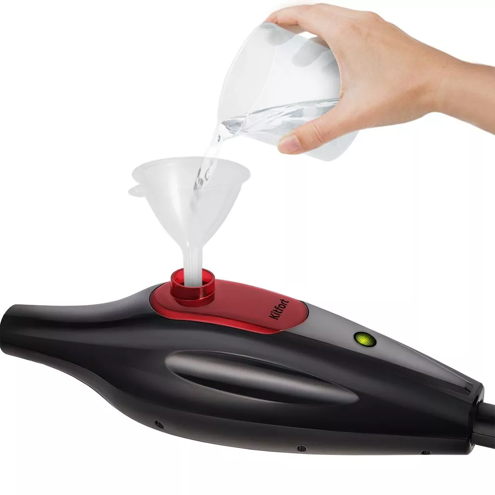 Устройство оснащено резервуаром для воды ёмкостью 350 мл, что позволяет производить непрерывную уборку 10-15 минут. Мерный стакан позволит отмерить нужный объём воды, а воронка поможет удобно залить ее в резервуар.