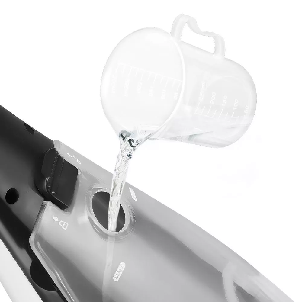 Устройство оснащено резервуаром для воды ёмкостью 380 мл, что позволяет производить непрерывную уборку 10-15 минут. Для удобного наливания воды в комплекте предусмотрен мерный стакан.