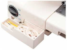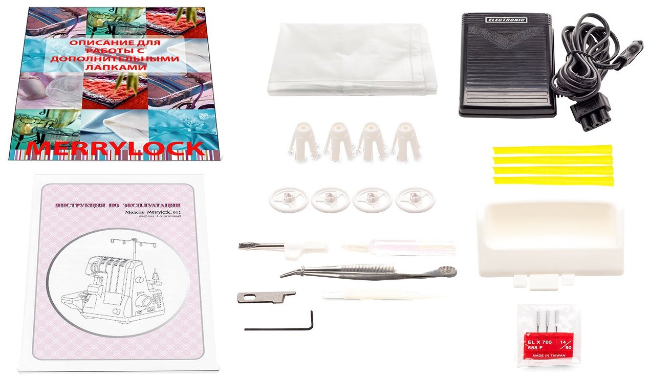 запасной верхний нож, катушечные колпачки, ключ шестигранник, масленка, мусоросборник, набор игл, отвертка, пинцет, сетка, щеточка