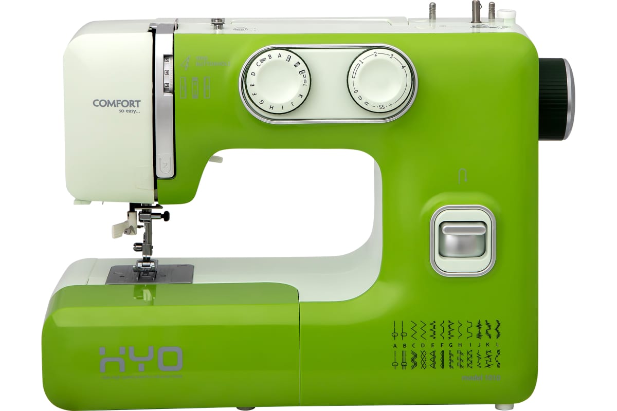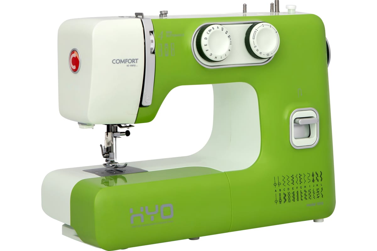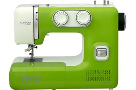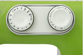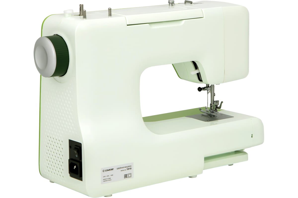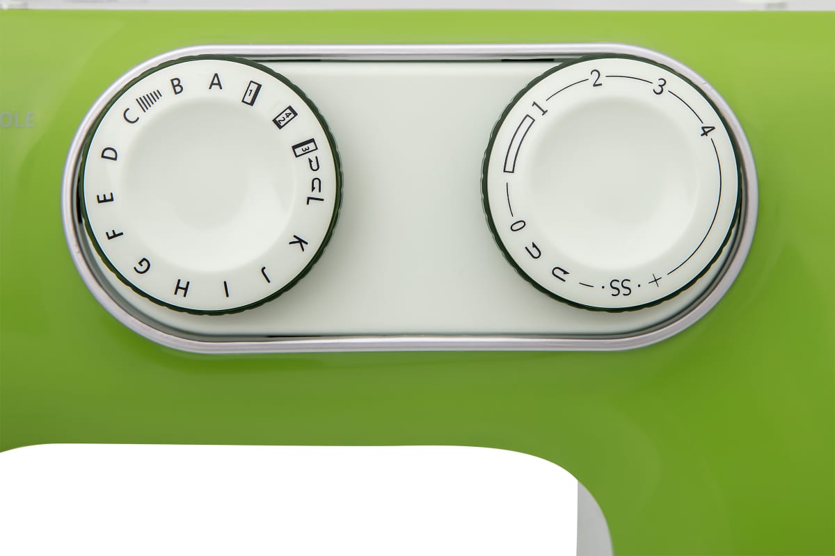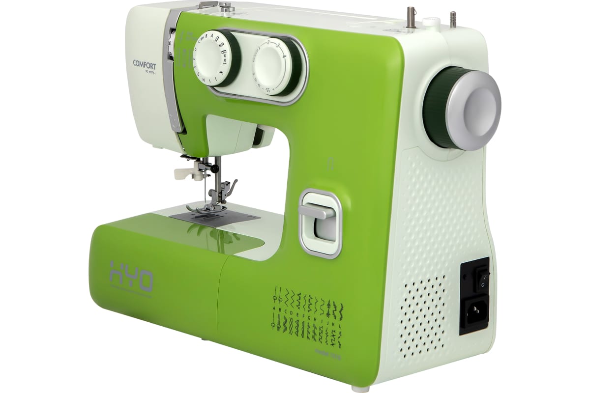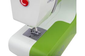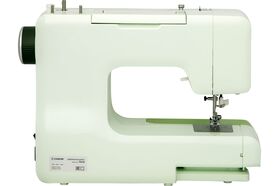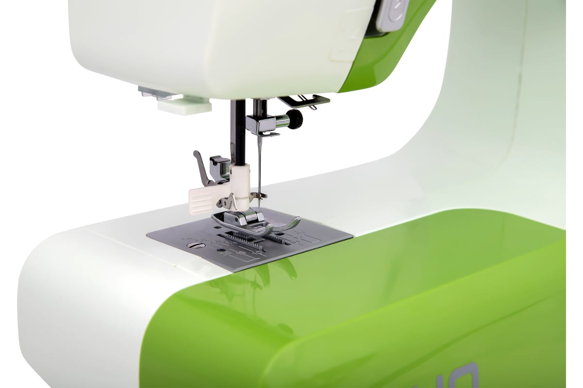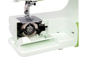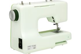 Швейная машина зеленого цвета выполнена в высокопрочном пластиковом корпусе с вертикально расположенной катушкой, механизмом для вдевания нити, нитеобрезателем и светодиодной подсветкой. Модель с габаритами 29х37х15 см и весом 6 кг отличается устойчивым основанием с прорезиненными ножками и ручкой для переноски.
