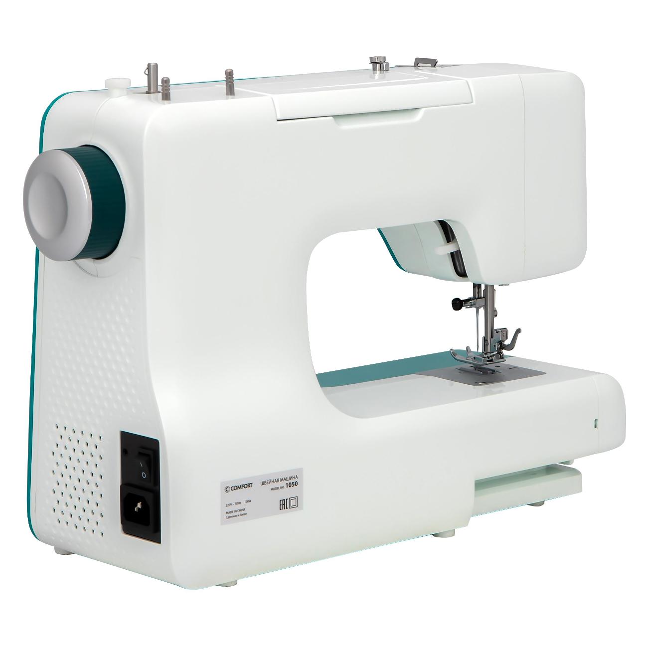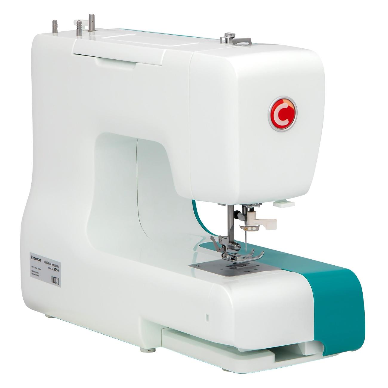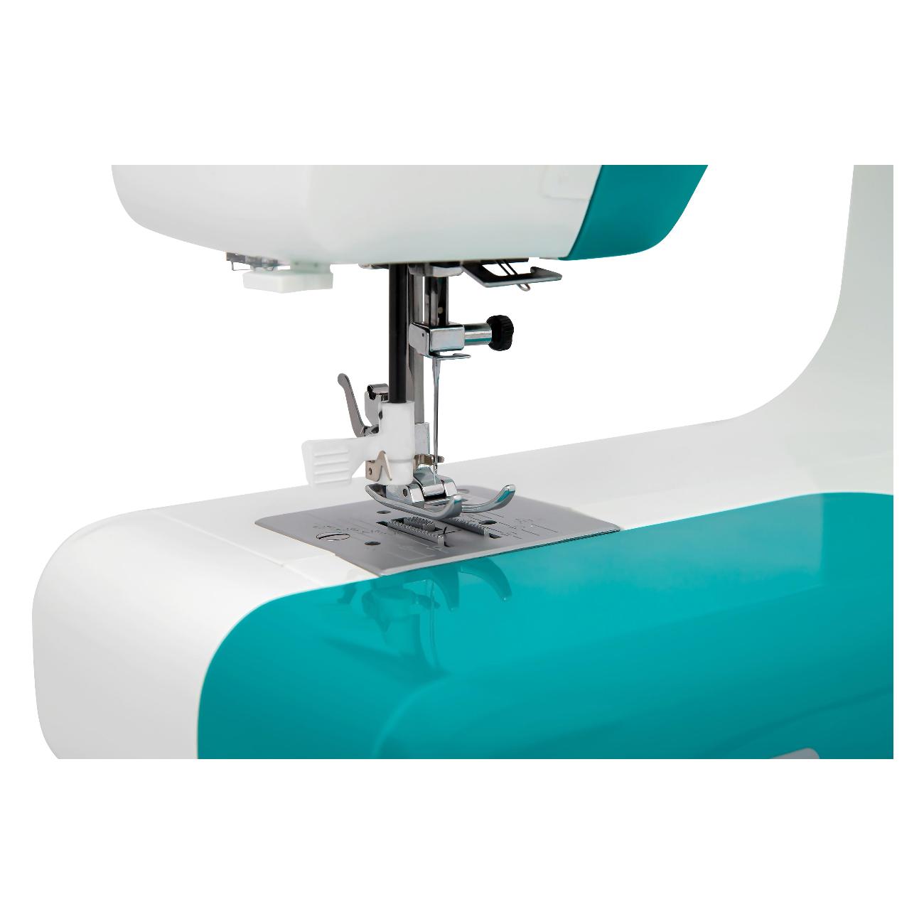 Швейная машина бирюзового цвета выполнена в высокопрочном пластиковом корпусе с вертикально расположенной катушкой, механизмом для вдевания нити, нитеобрезателем и светодиодной подсветкой. Модель с габаритами 29х37х15 см и весом 6 кг отличается устойчивым основанием с прорезиненными ножками и ручкой для переноски.