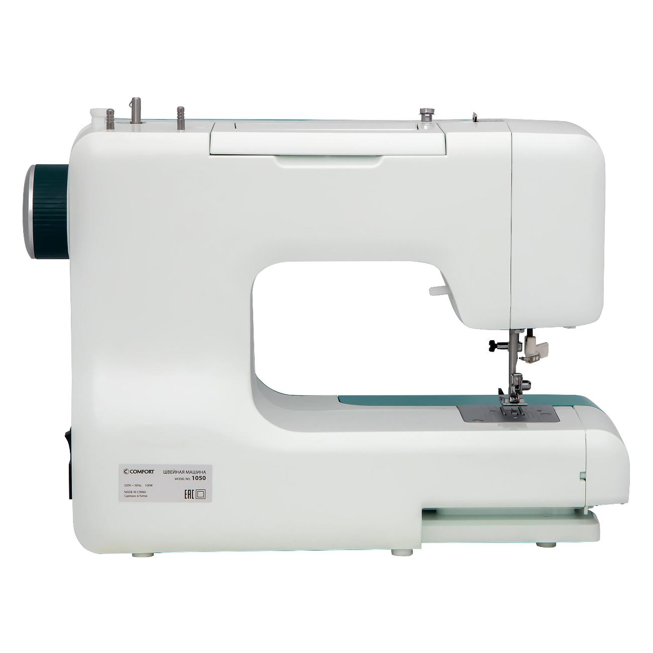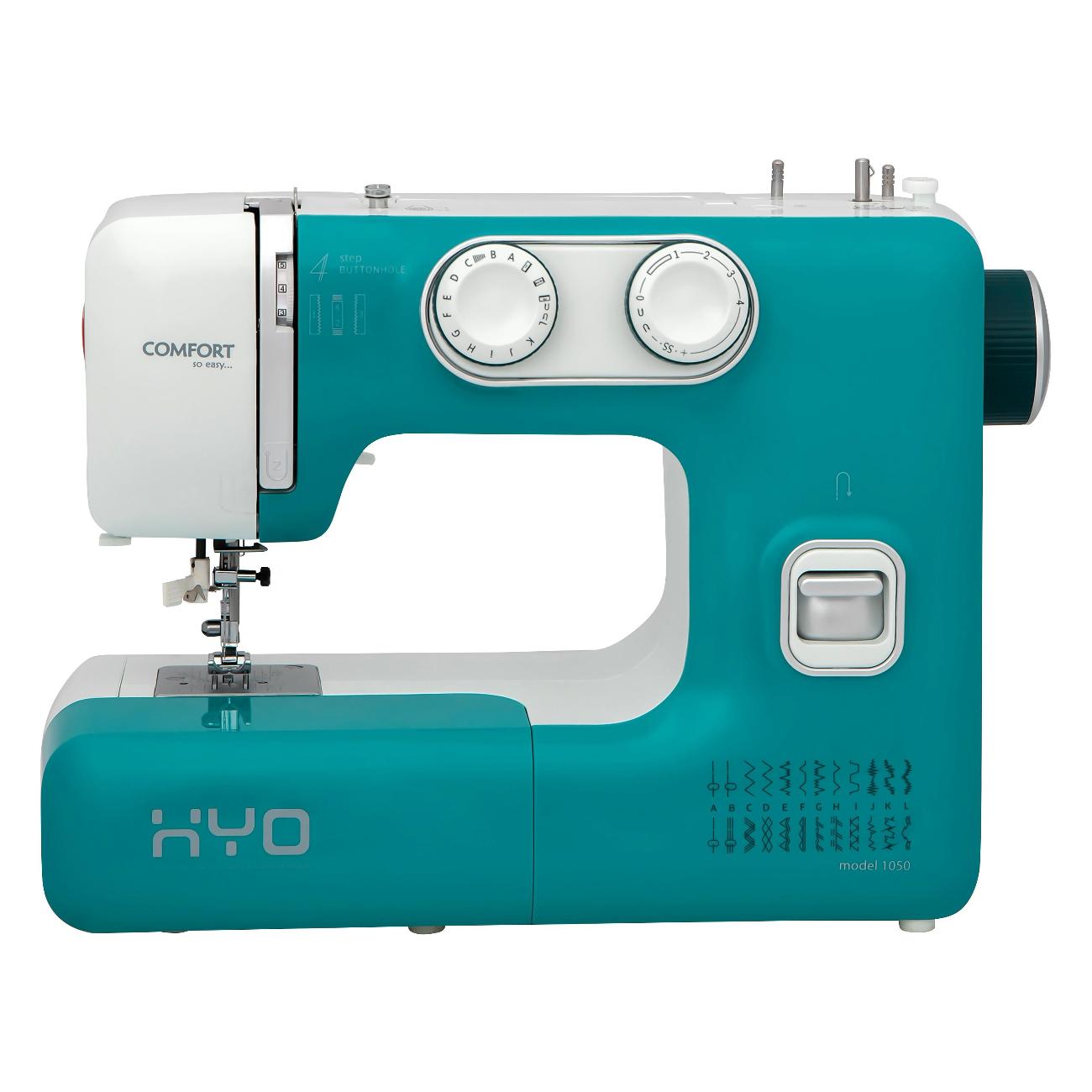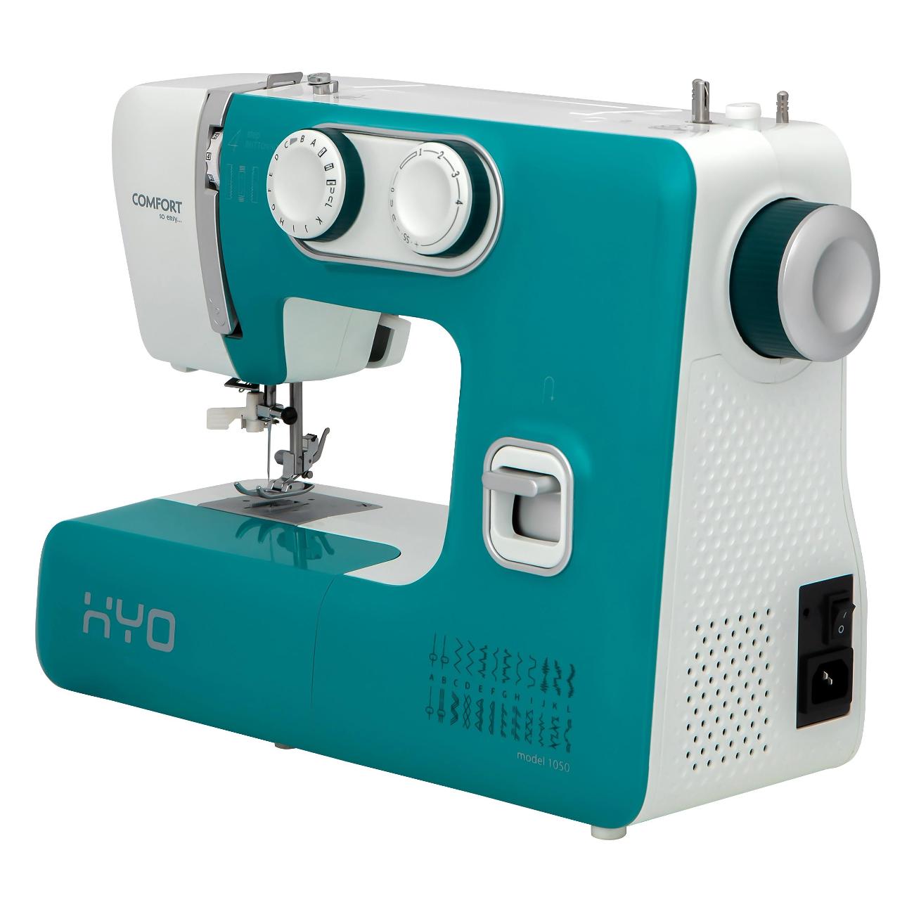 Швейная машина бирюзового цвета выполнена в высокопрочном пластиковом корпусе с вертикально расположенной катушкой, механизмом для вдевания нити, нитеобрезателем и светодиодной подсветкой. Модель с габаритами 29х37х15 см и весом 6 кг отличается устойчивым основанием с прорезиненными ножками и ручкой для переноски.