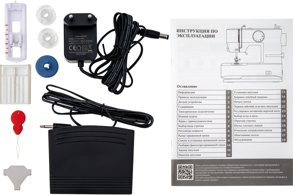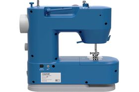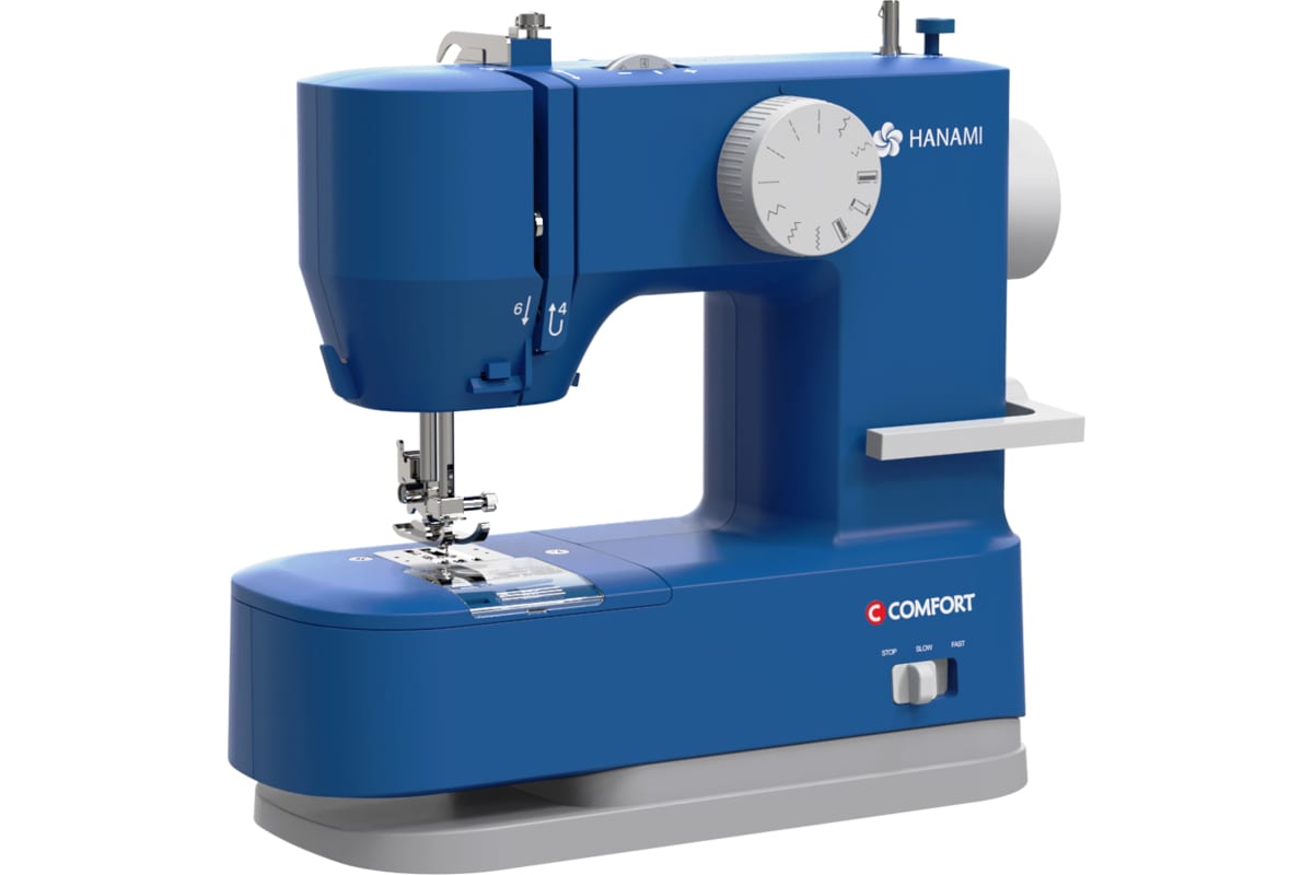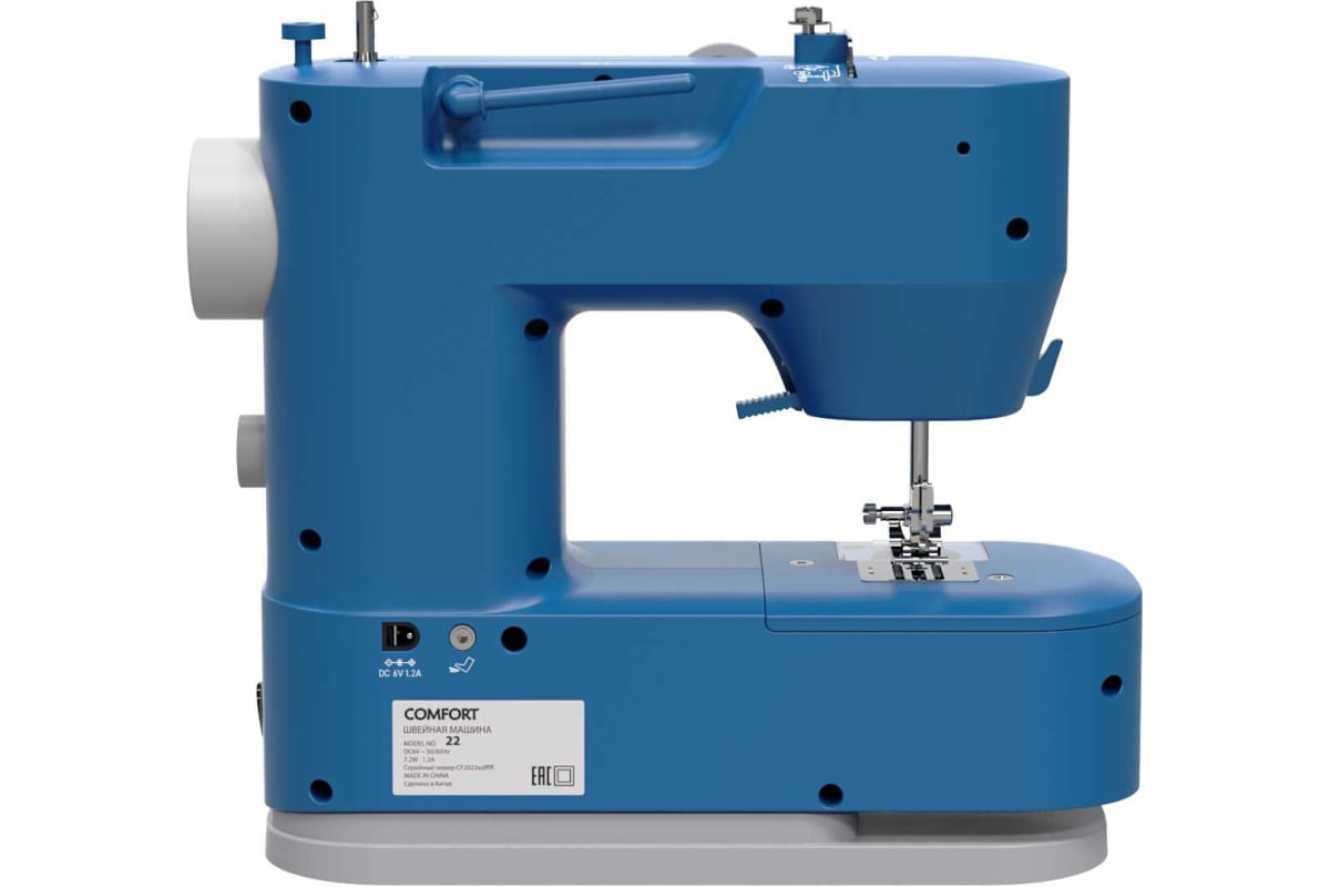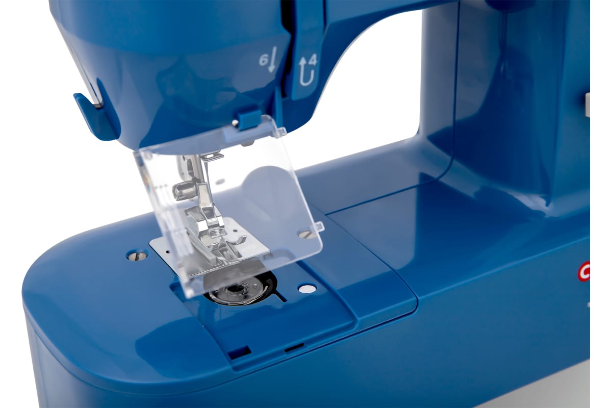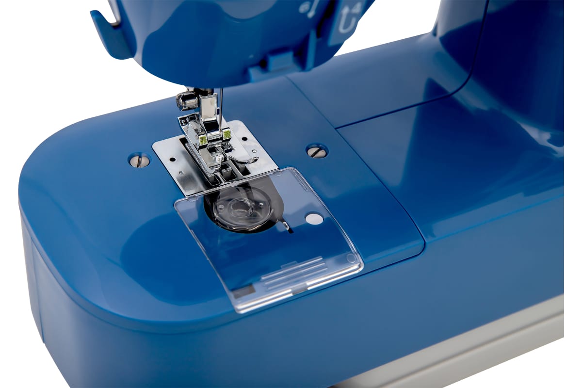 Швейная машина синего цвета идет в комплекте с тремя шпульками и стандартной лапкой. Скорость шитья достигает 350 стежков в минуту. Рабочая зона подсвечивается с помощью светодиодной лампочки. Габариты модели — 26х28х12 см. Вес изделия — 2,6 кг. Длина кабеля составляет 1,4 м. Мощность прибора — 7 Вт. Присутствует функция реверса. Лапка поднимается на 7 мм. Длина стежка регулируется до 4 мм. Корпус сделан из пластика, оснащен горизонтальной катушкой, нитеобрезателем, ручкой для переноски. Прорезиненные ножки не скользят по поверхности.