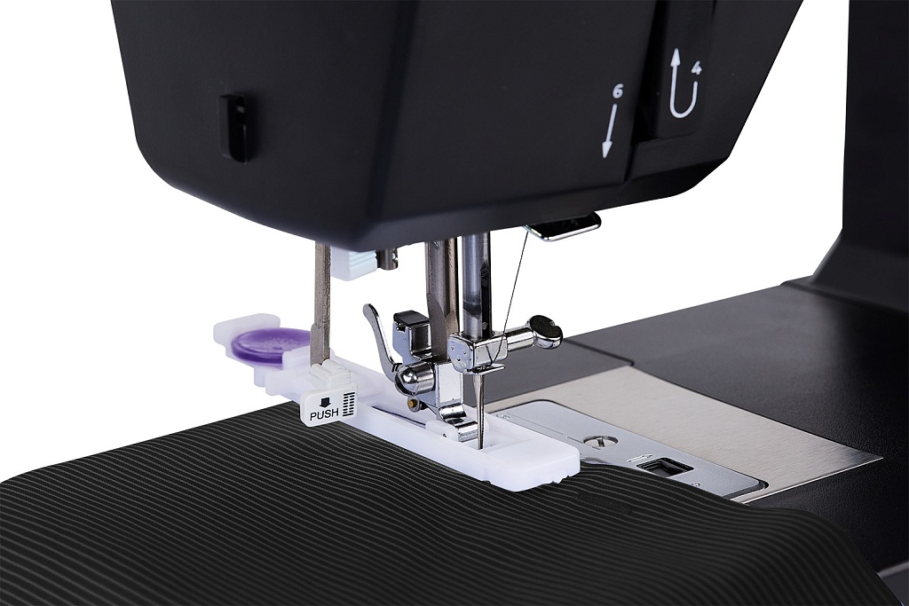 С помощью регулятора скорости шитья можно установить максимальную скорость 800 ст./мин. Кнопкой устанавливается положение иглы: при окончании шитья игла может останавливаться в нижнем положении и удерживать ткань. Используя кнопку Старт/Стоп, можно уверенно шить без педали.