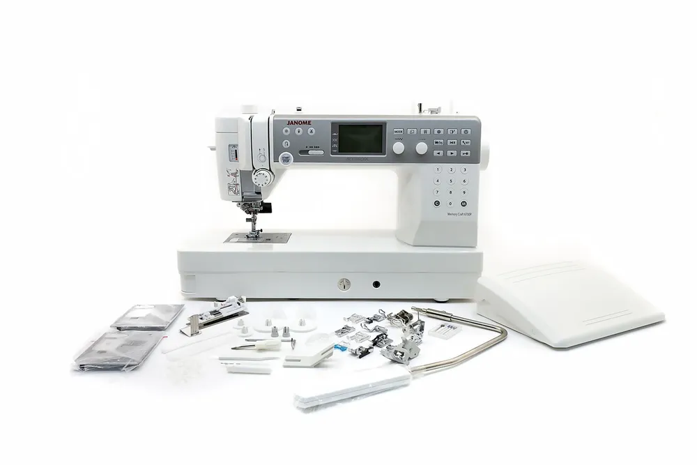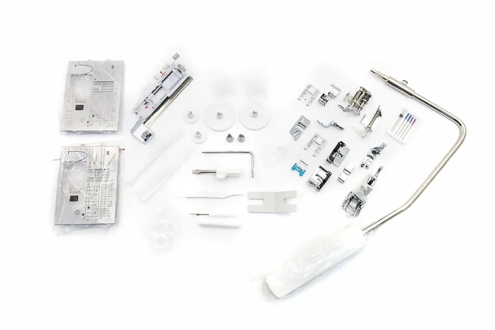Быстросъемная лапка, Вертикальный катушечный стержень, Автоматическая обрезка нитей, Коленный рычаг, Отсек для принадлежностей, Приставной столик (поле шитья), Увеличенное поле шитья