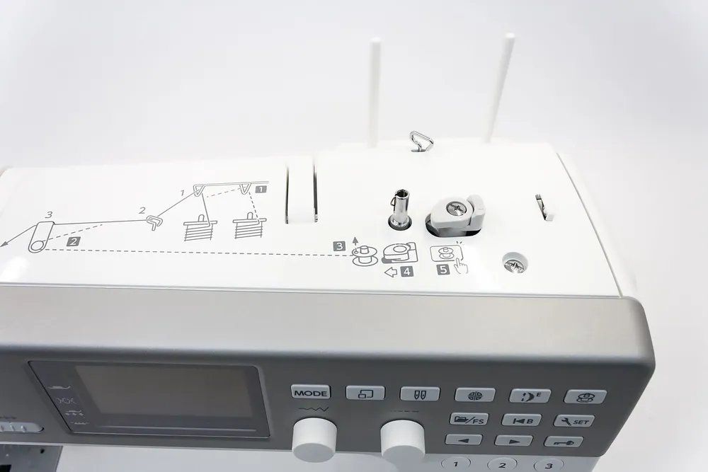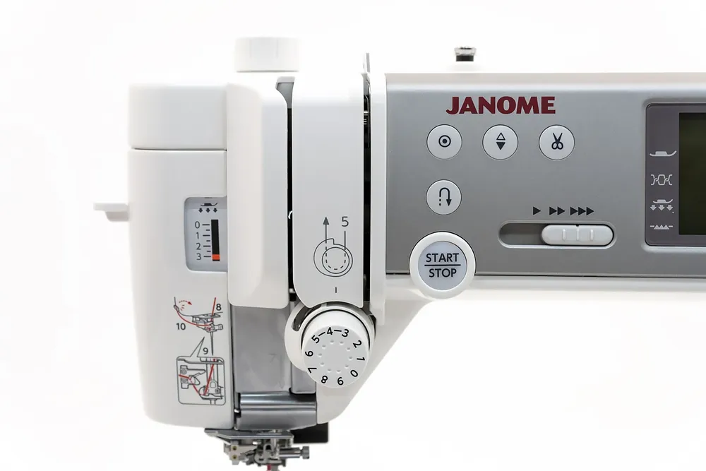 Верхний транспортёр, Дисплей, Кнопка позиционирования иглы, Подсветка рабочей зоны, Реверс, Регулировка скорости шитья, Регулятор давления лапки на ткань, Регулятор длины стежка, Шитье двойной иглой, Стабилизатор силы прокола