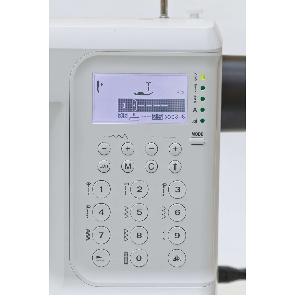 Регулировка ширины стежка позволяет подобрать строчку точно по необходимости, шаг изменения ширины — 1 мм.