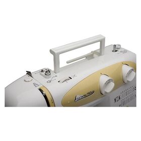 Лапку можно отрегулировать по высоте — максимальный уровень подъема составляет 11 мм. Степень натяжения нити регулируется вручную. Корпус выполнен из пластика, устойчивого к механическому воздействию — в нем предусмотрен отсек, рассчитанный на хранение аксессуаров. Специальная ручка упрощает перемещение швейной машины. В комплекте несколько лапок, среди которых стандартная, для молний и для пришивания пуговиц. Дополнительно в набор входят иглы, вспарыватель, масленка, отвертка и чехол. Длина сетевого шнура составляет 1 м. Мощность потребления — около 70 Вт. Габаритные размеры составляют 30х40х20 см, вес — 5,7 кг.