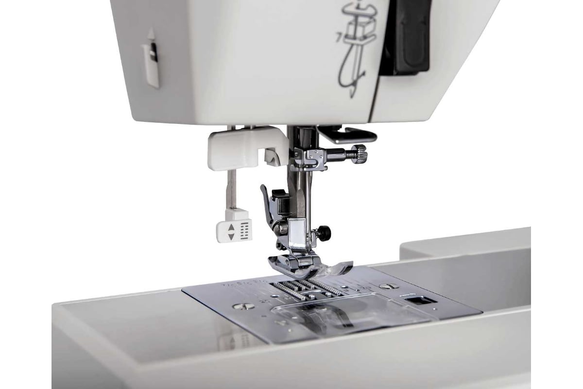 На машине установлена универсальная прижимная лапка Так же в комплекте поставки машины имеется лапка для пуговичных петель, лапка для пришивания пуговицы, лапка для молнии и направляющая для квилтинга Лапки крепятся к полностью стальному лапкодержателю быстросъемного типа Чтобы заменить лапку достаточно нажать на рычаг лапкдержателя и лапка отсоединится Для установки новой - лапка просто подводится под лапкодержатель и рычагом на корпусе машинки он опускается вниз Все Лапка автоматически надежно защелкнулась