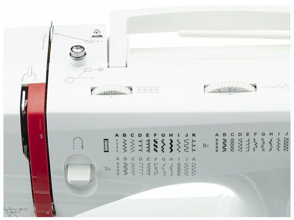 Машина обладает широким набором функций, имеет рычаг обратного хода для выполнения закрепки или штопки и выполняет петлю в автоматическом режиме.