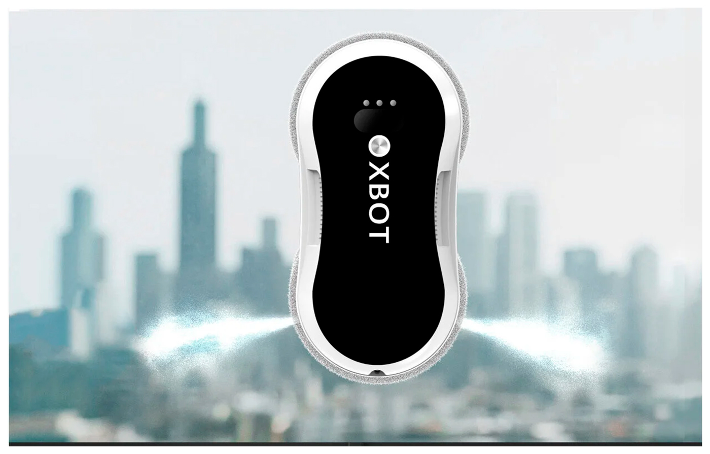 Робот распыляет воду на стекло с помощью двух форсунок. Жидкость обильно увлажняет поверхность, размягчая загрязнения. После этого робот эффективно удаляет их салфеткой.