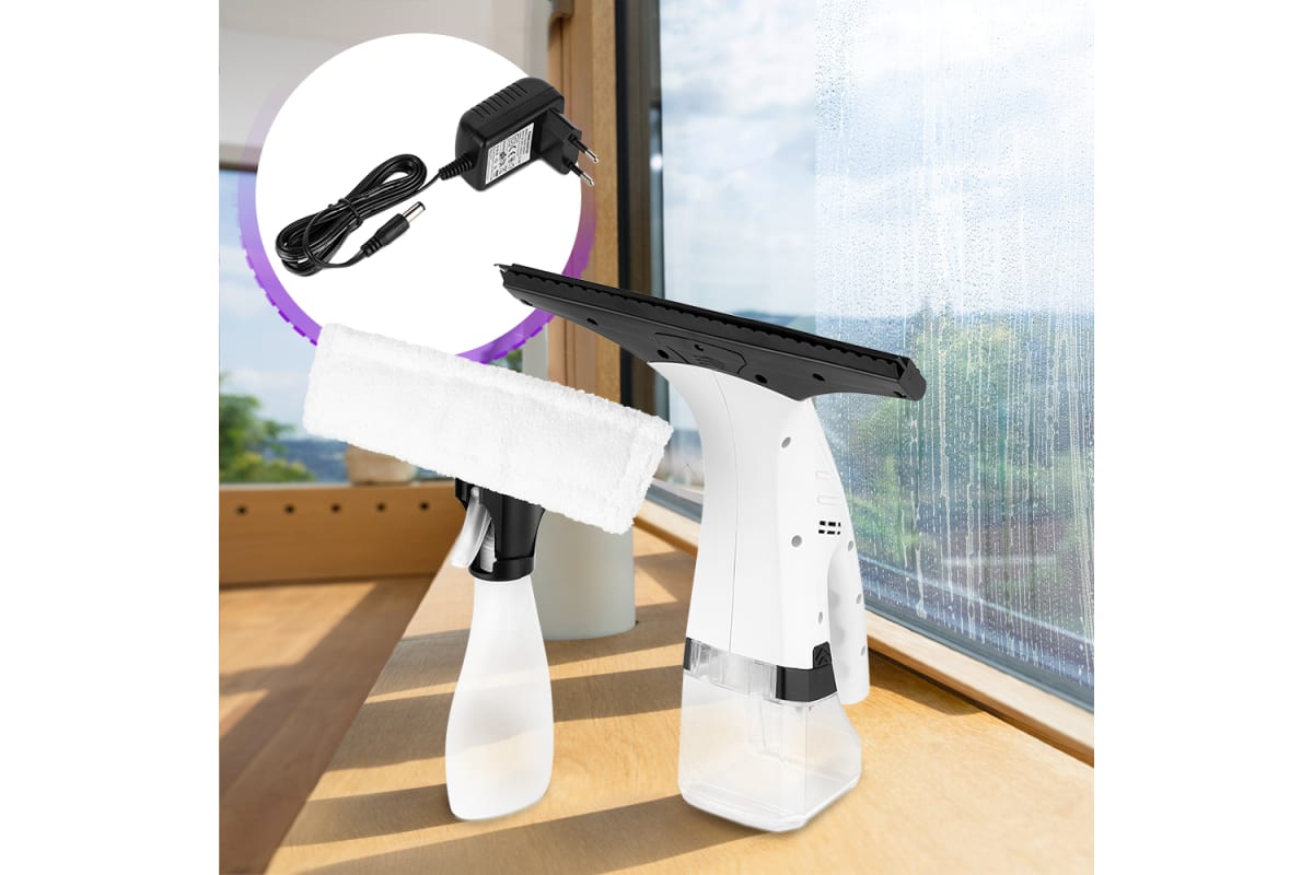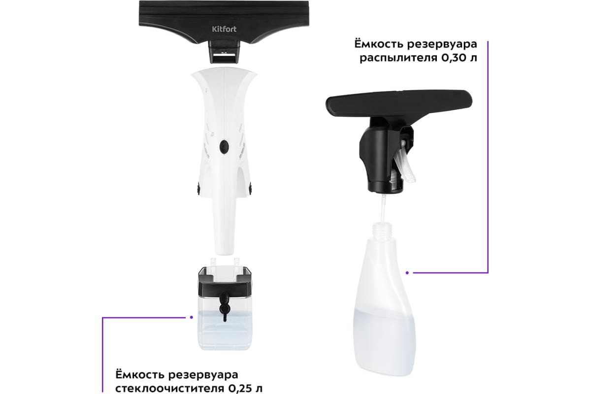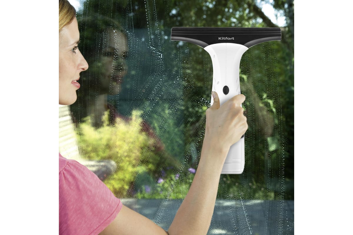 Стеклоочиститель КТ-5163 — это набор «3 в 1» для мойки стекол, зеркал, кафельных и других твердых гладких поверхностей. В комплект входит распылитель, моющая насадка с тряпкой из микрофибры и сам стеклоочиститель — небольшой аккумуляторный пылесос для всасывания жидкостей с плоских поверхностей.